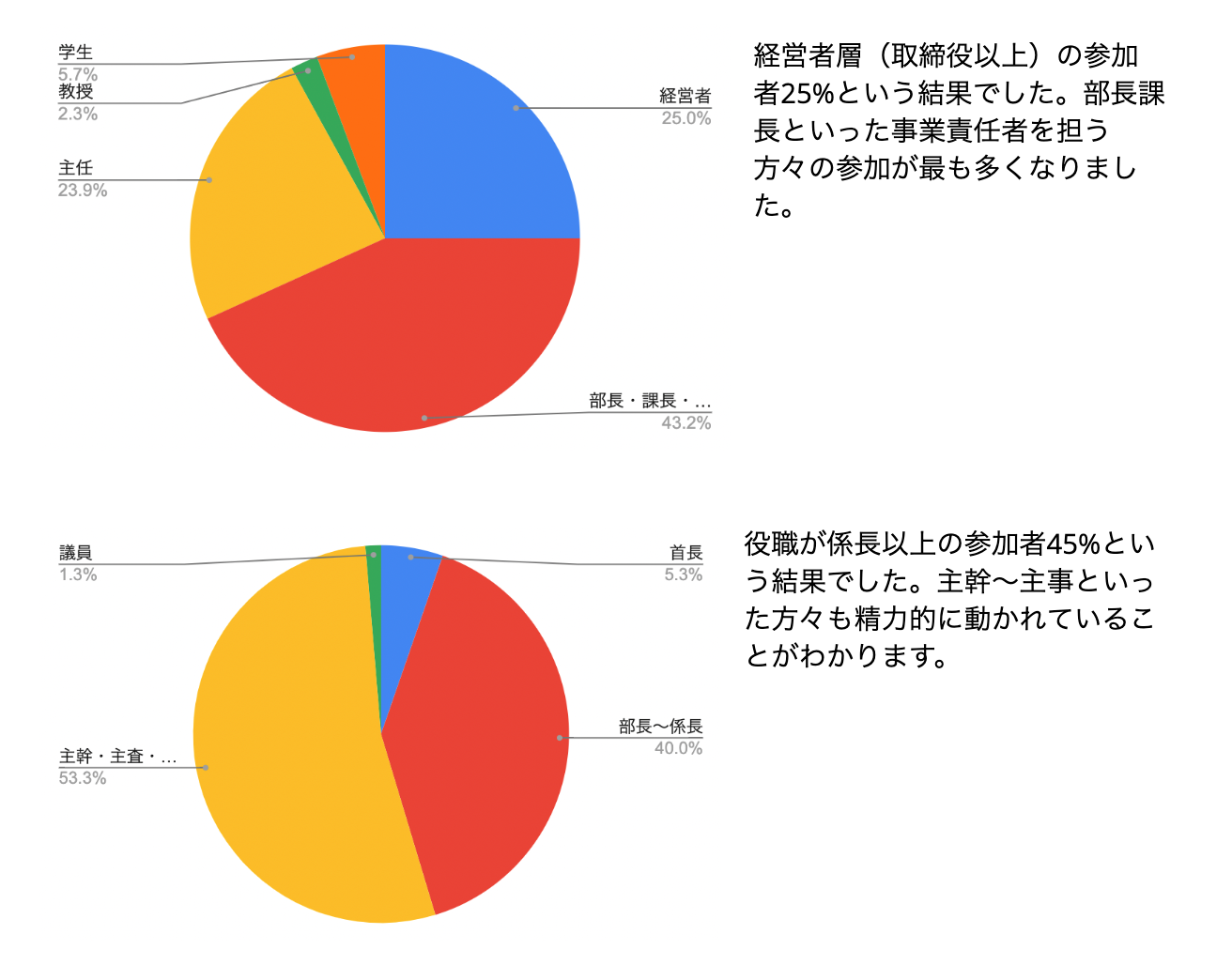 参加者は民間企業が6.5割、行政が3.5割のうち、民間企業は経営者層(取締役以上)の参加者25%、行政は係長以上の役職の参加者が45%と、全体として事業責任者以上の、決済権を担う方の参加が高く、イベント開催時のみの盛り上がりで終わるのではなく、その後の継続的な繋がりやプロジェクト連携が行われていることが大きな特徴です。