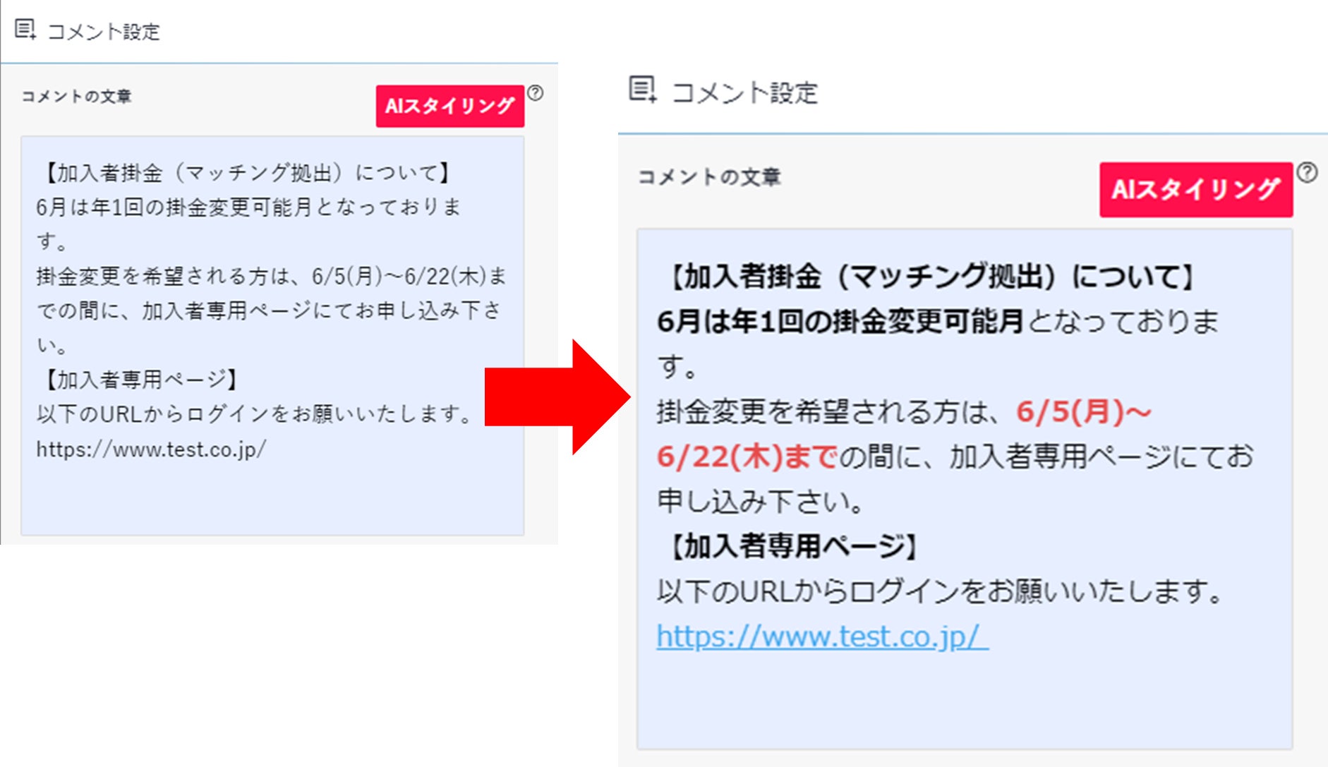 AIスタイリングは、生成AI(ChatGPT)を用いた自動テキストスタイリング機能です。ナビゲーション上に表示する吹き出しおよびコメント、システム画面上に項目説明を追加するツールチップにおいて、ユーザーにとって重要と思われる箇所を、ボタン1つで簡単に装飾することができます。これにより、利用者にとって理解しやすいナビゲーションを、より簡単に作成できるようになります。