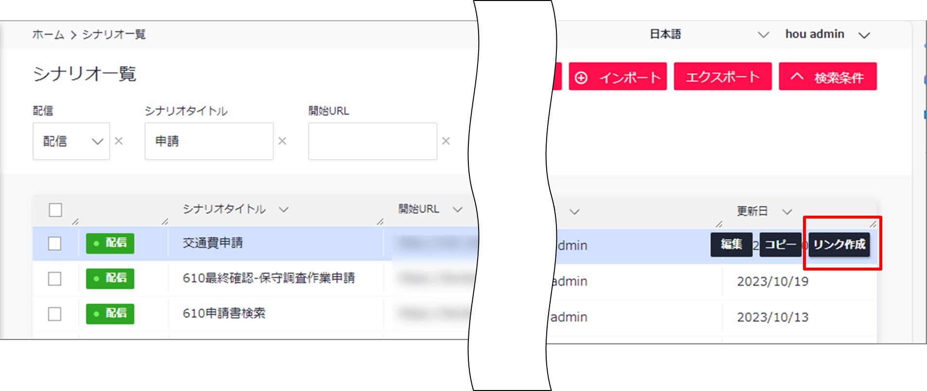 Dojoナビのシナリオ再生を開始するための、URL生成機能です。Dojoナビの管理画面に「リンク生成」ボタンが表示され、生成したURLはDojoナビのツールチップやメールなどで共有することができます。当該URLにアクセスすると、Dojoナビのシナリオ再生が開始されます。