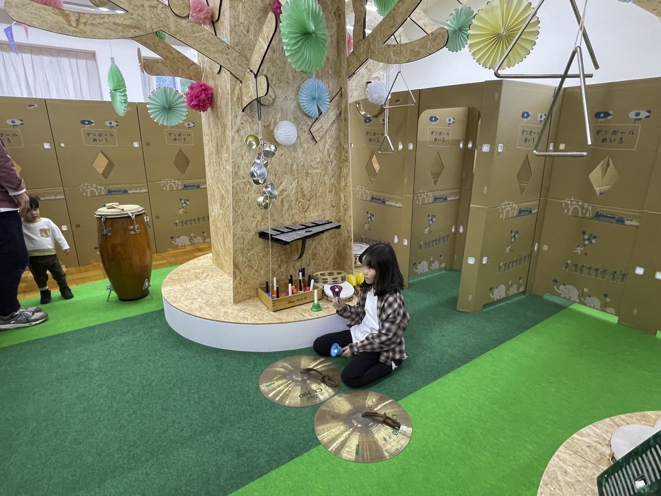 迷路の途中には「がっきの木」を設置。タンバリンやシンバル、トライアングルなどのさまざまな楽器を楽しく鳴らしてみよう。設置している楽器は、廃校になった学校の楽器を使っているよ。