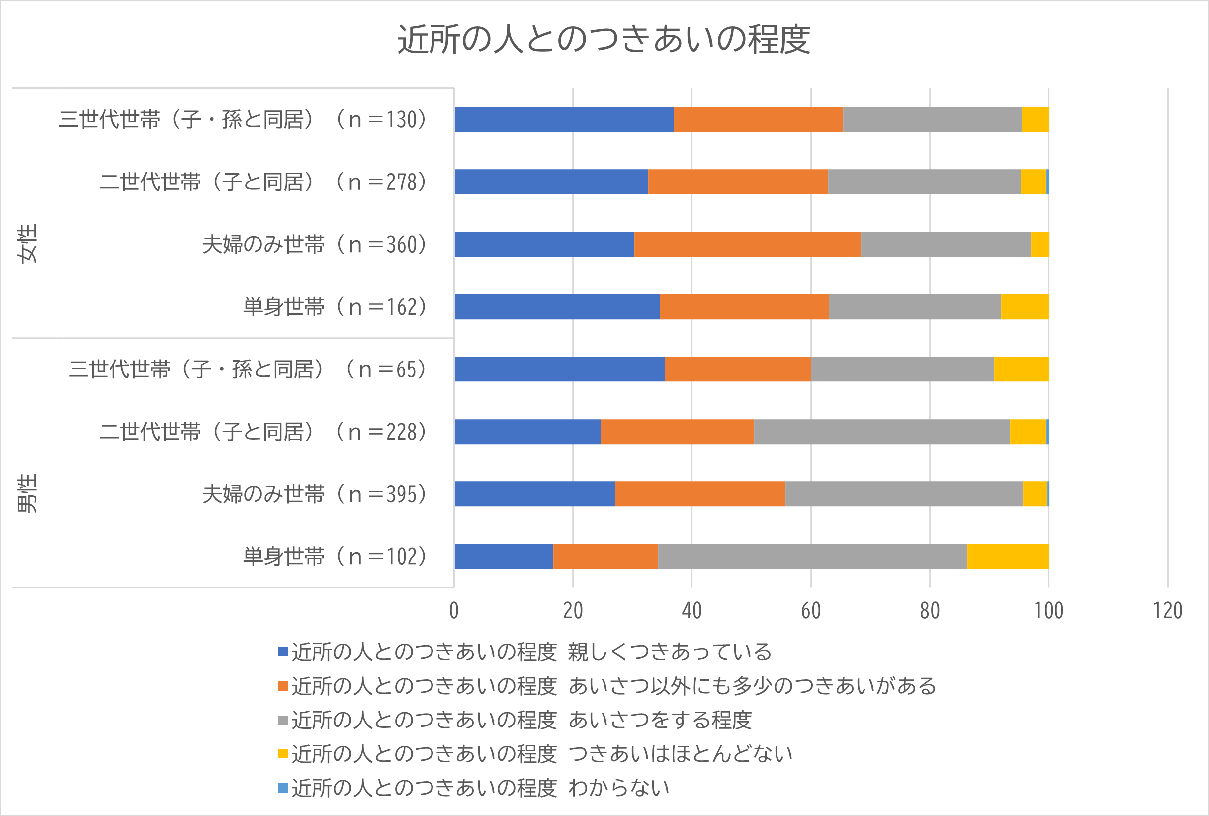 また、近所の人との付き合いの程度についての質問では、男女の差が非常に顕著であり、男性の単身世帯では「あいさつをする程度」が半数以上であり、「つきあいはほとんどない」と回答する割合も他より高いことがわかります。