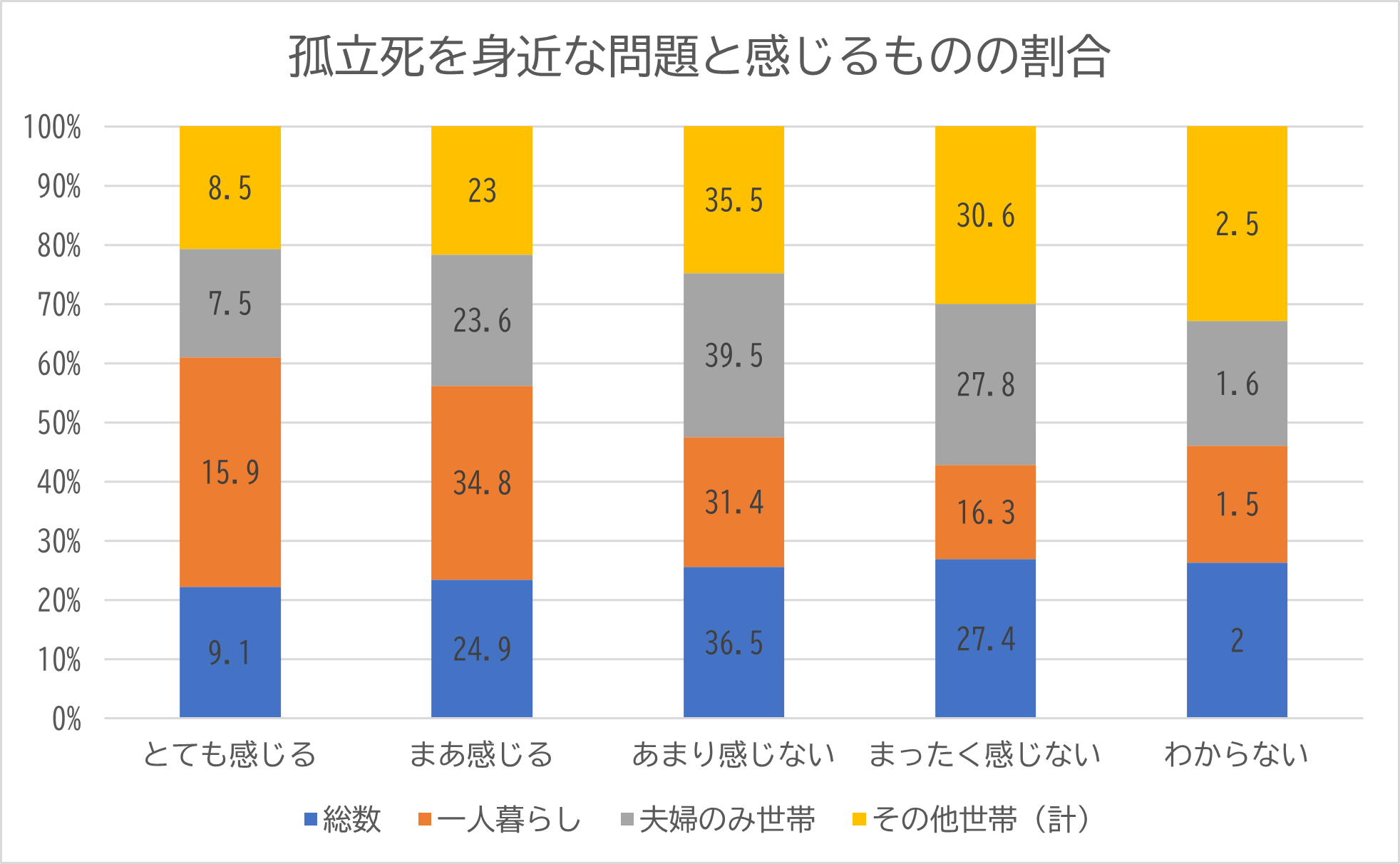 孤立死を身近な問題だと感じる(「とても感じる」と「まあ感じる」の合計)人の割合は、60歳以上の全体では34.1%であるものの、一人暮らし世帯では50.8%と5割を超えた数値になっています。