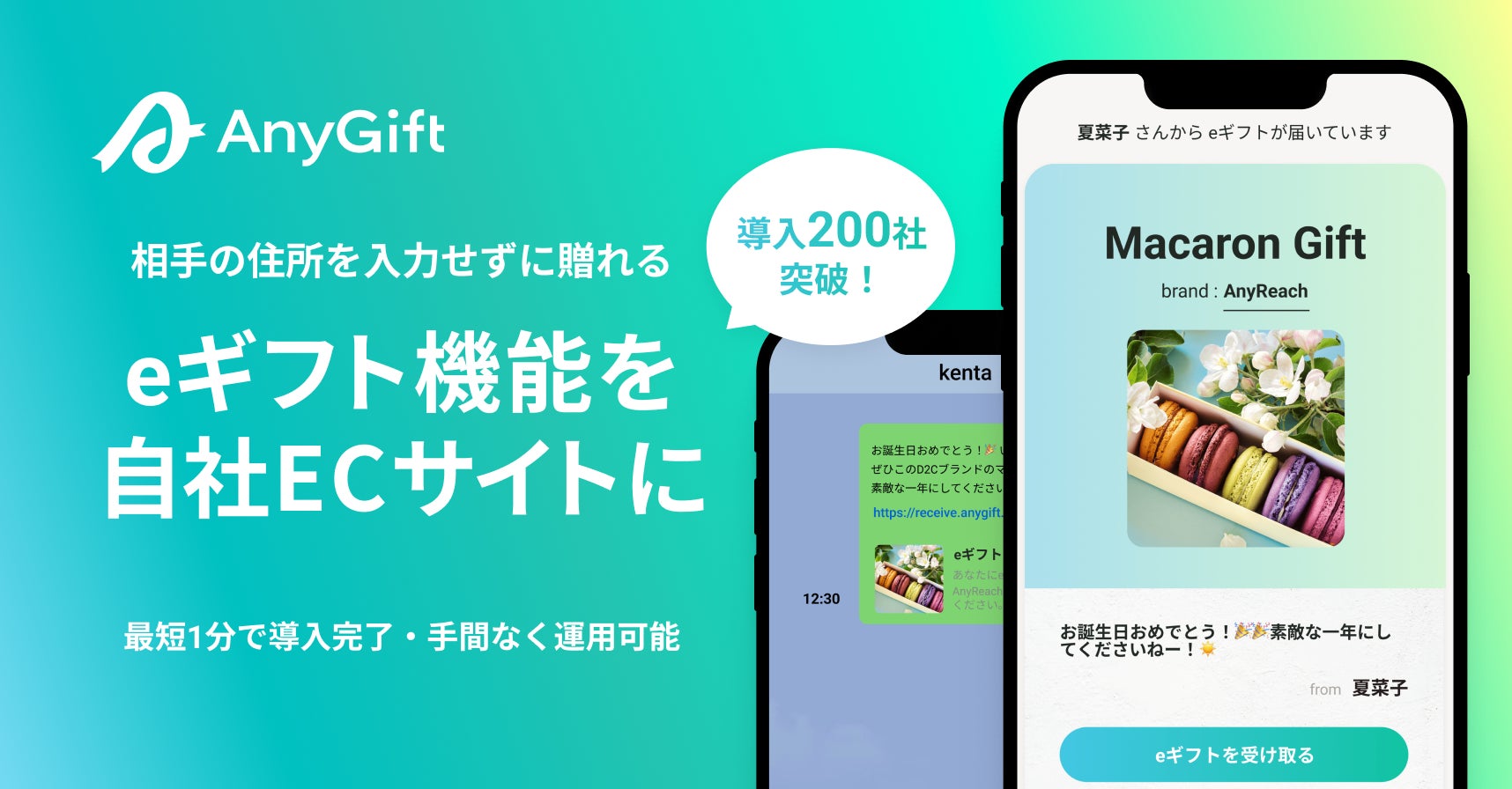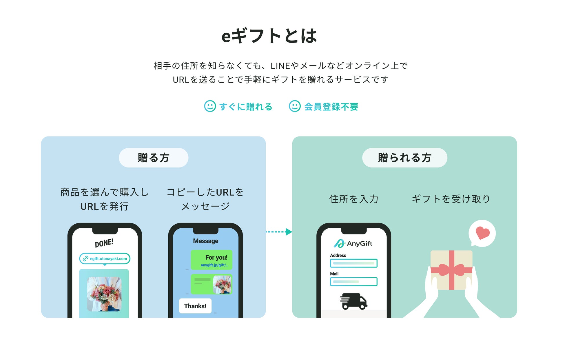 「AnyGift」を導入することにより、今後は、相手のLINEやSNS、メールアドレスが分かれば、購入後に発行されるeギフトのURLを送信するだけで、相手の希望日時に商品を届けることができるようになります。
