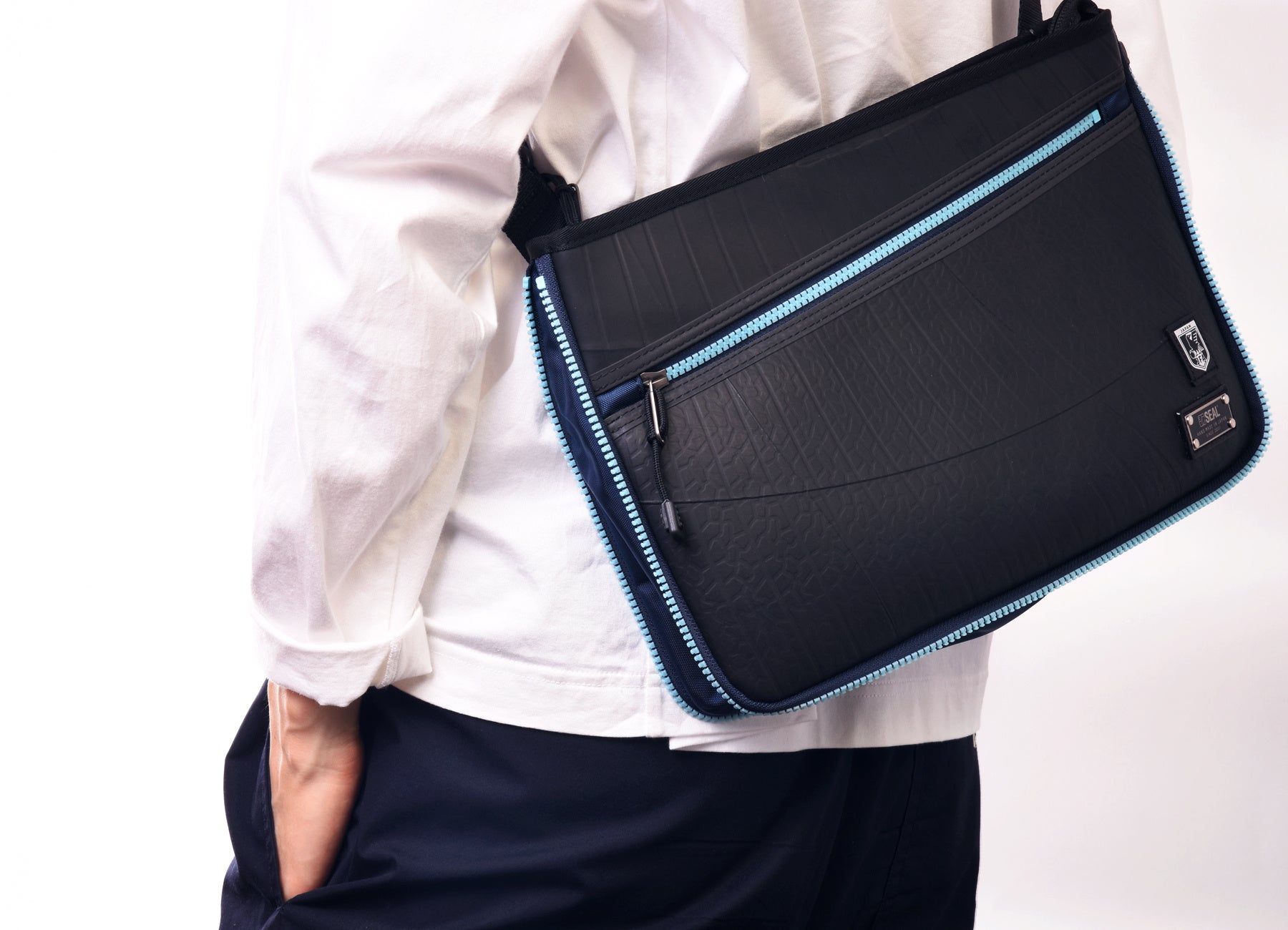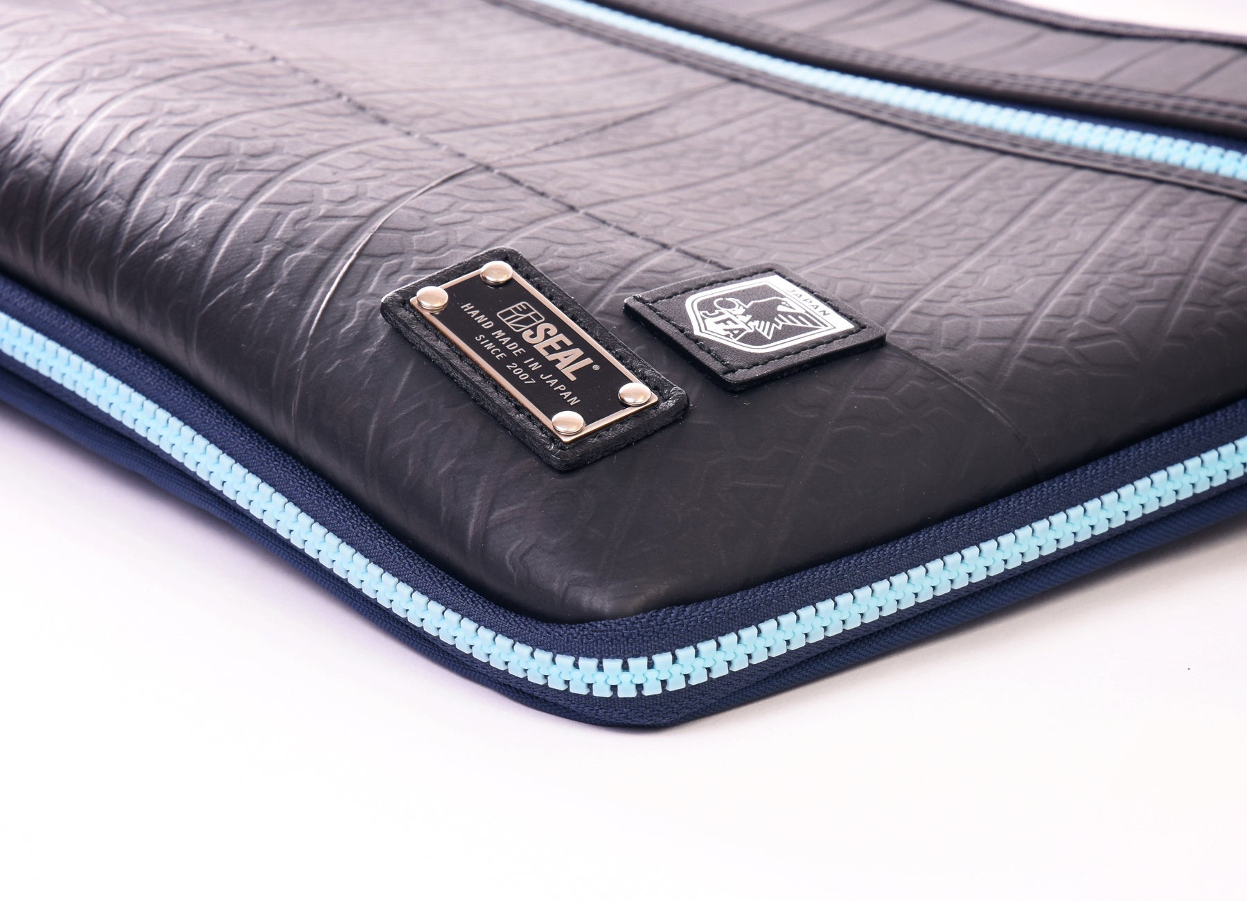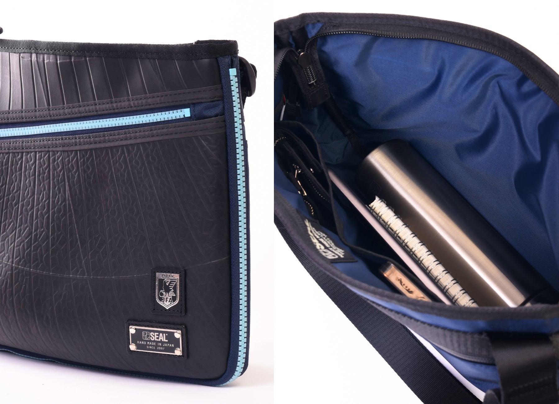 スポーツやアウトドアを好むユーザーの多い「SEAL」では、スポーツを楽しむ多くの方がスポーツ観戦やスポーツに関わる体験を、身につけるものでより楽しい気分にしていただきたいという願いから本製品を開発するに至りました。全面に採用している使用済みタイヤチューブは耐久性や防水性に優れており、屋外での利用に最適な素材です。その加工が難しい廃材を全て国内職人の手作業で一つ一つ縫製を行うことにより高い品質を実現し、SAMURAI BLUEのカラーを基調とした2つのアイテムが完成しました。