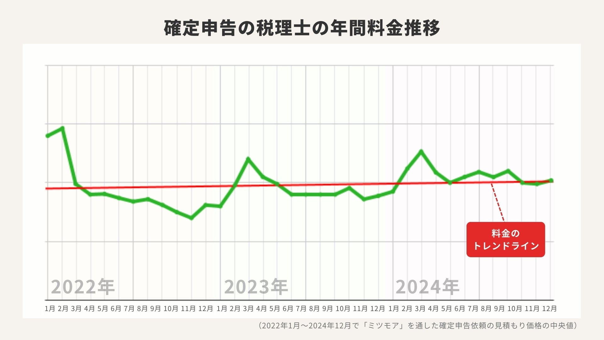 2022年から2024年までの3年間における確定申告の税理士費用を月次で集計したところ、毎年徐々に上昇傾向が見られました。