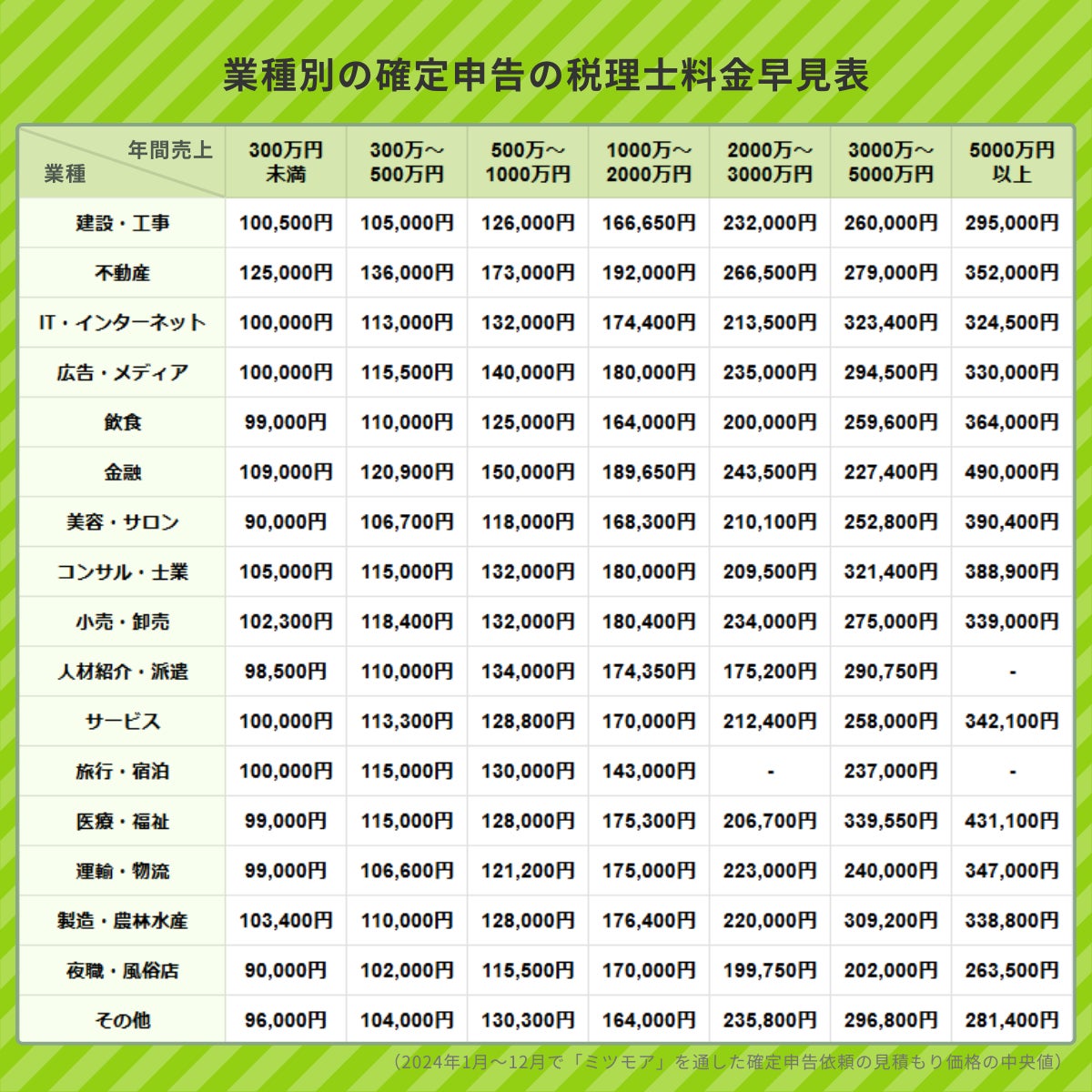 直近1年間の見積もり依頼データをもとに、業種ごとの年間売上規模に応じた確定申告の税理士費用をまとめました。