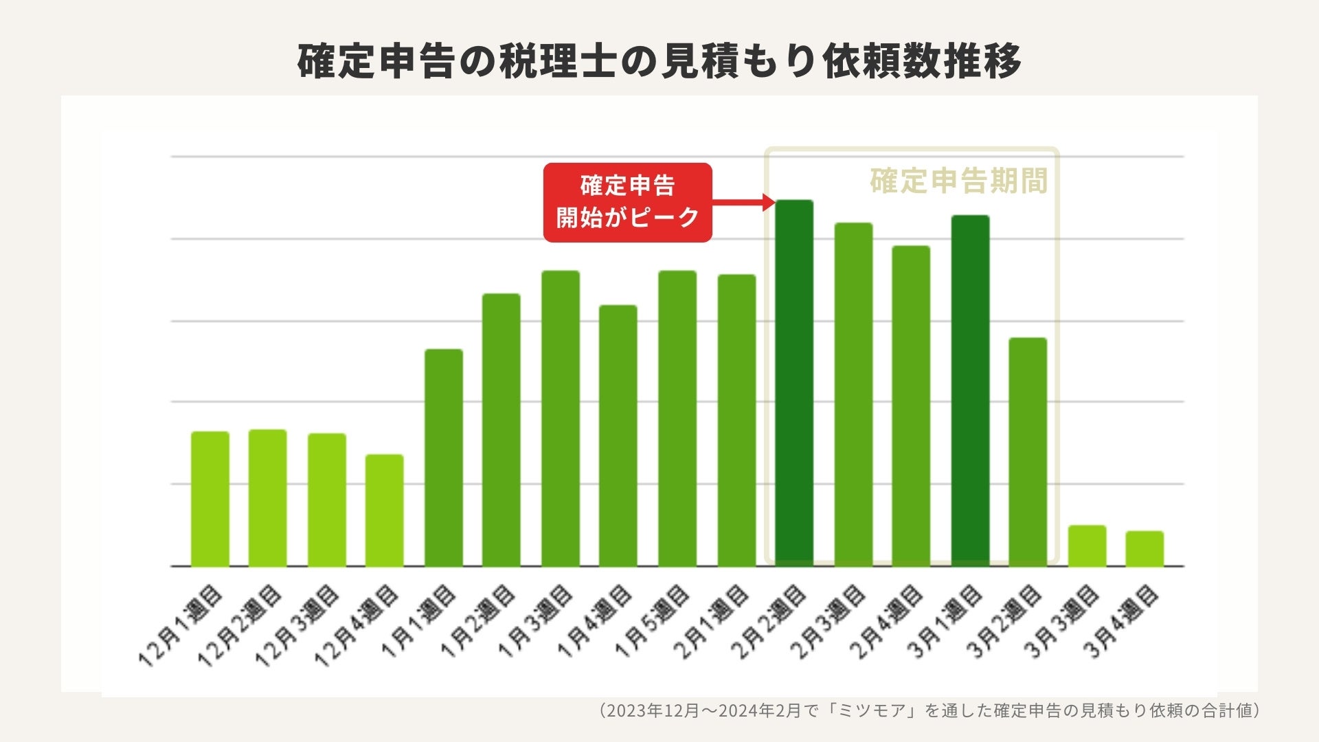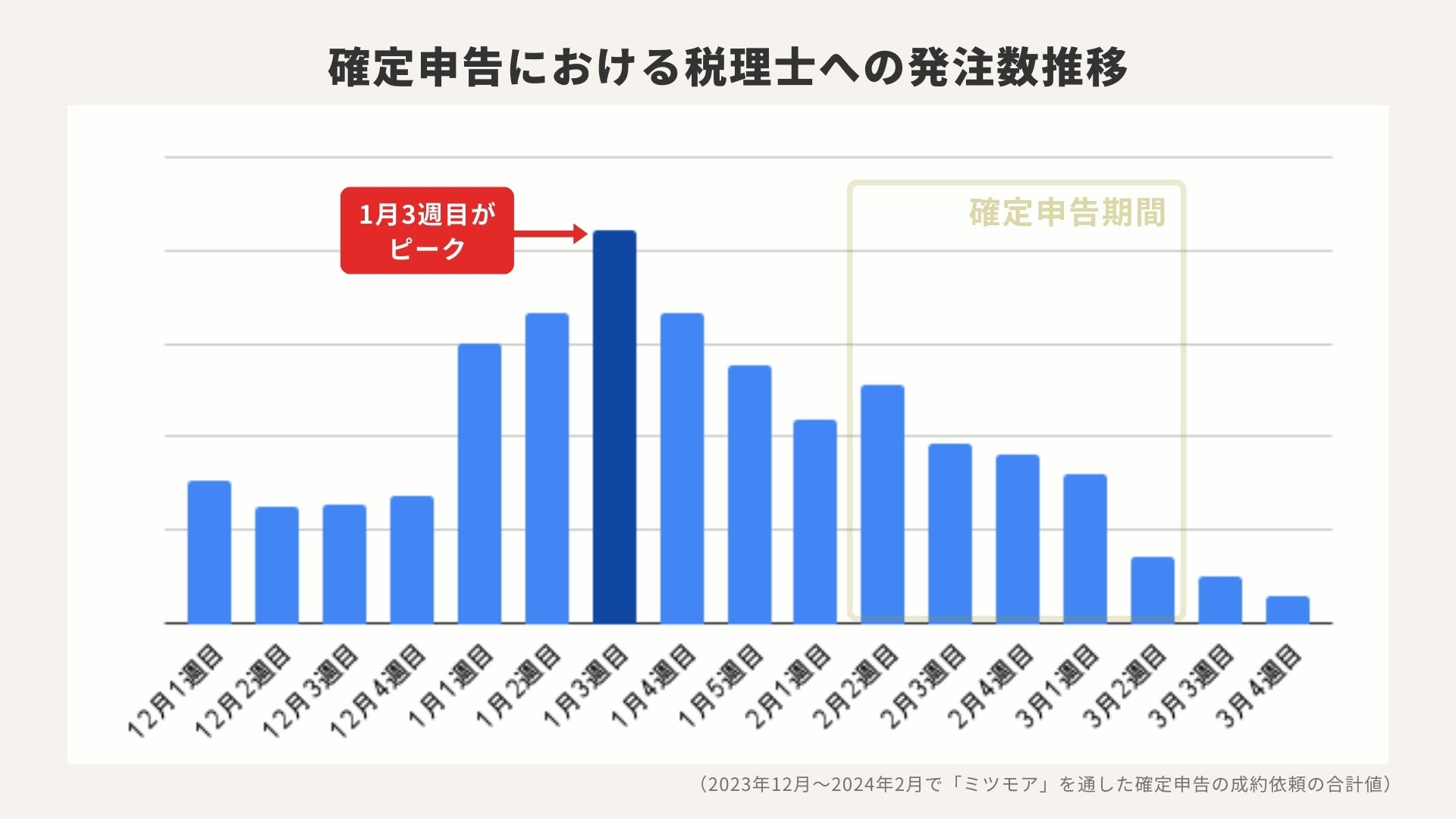 見積もり依頼は確定申告期間が最も多い一方で、実際に税理士へ発注する人は1月3週目がピークです。