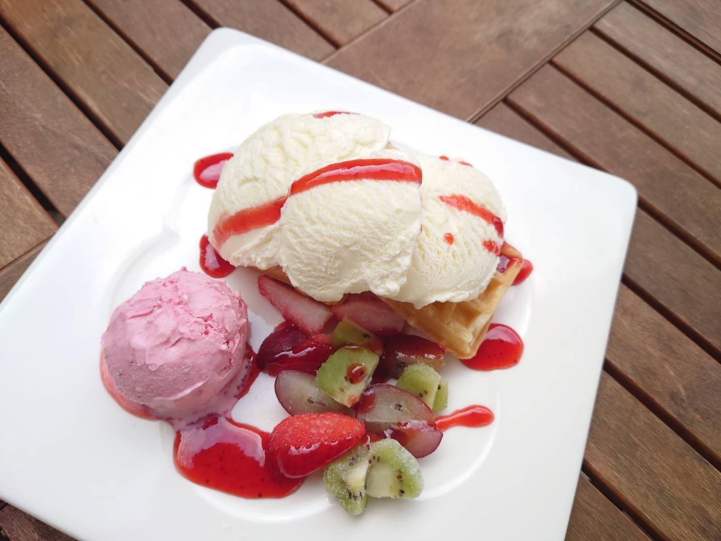 大きめなカットフルーツとビーツ・アイスクリーム。