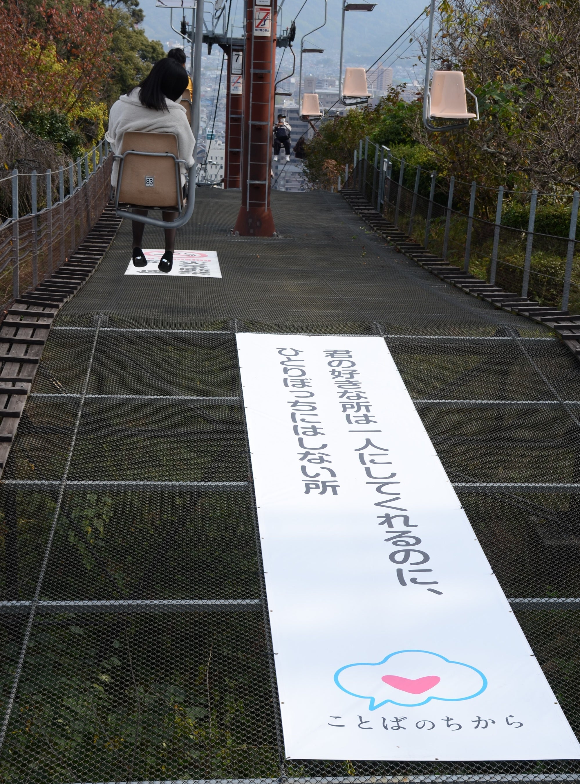 ▲ 各所に「ことば作品」を掲出する「街はことばのミュージアム」。松山城リフト下にも。