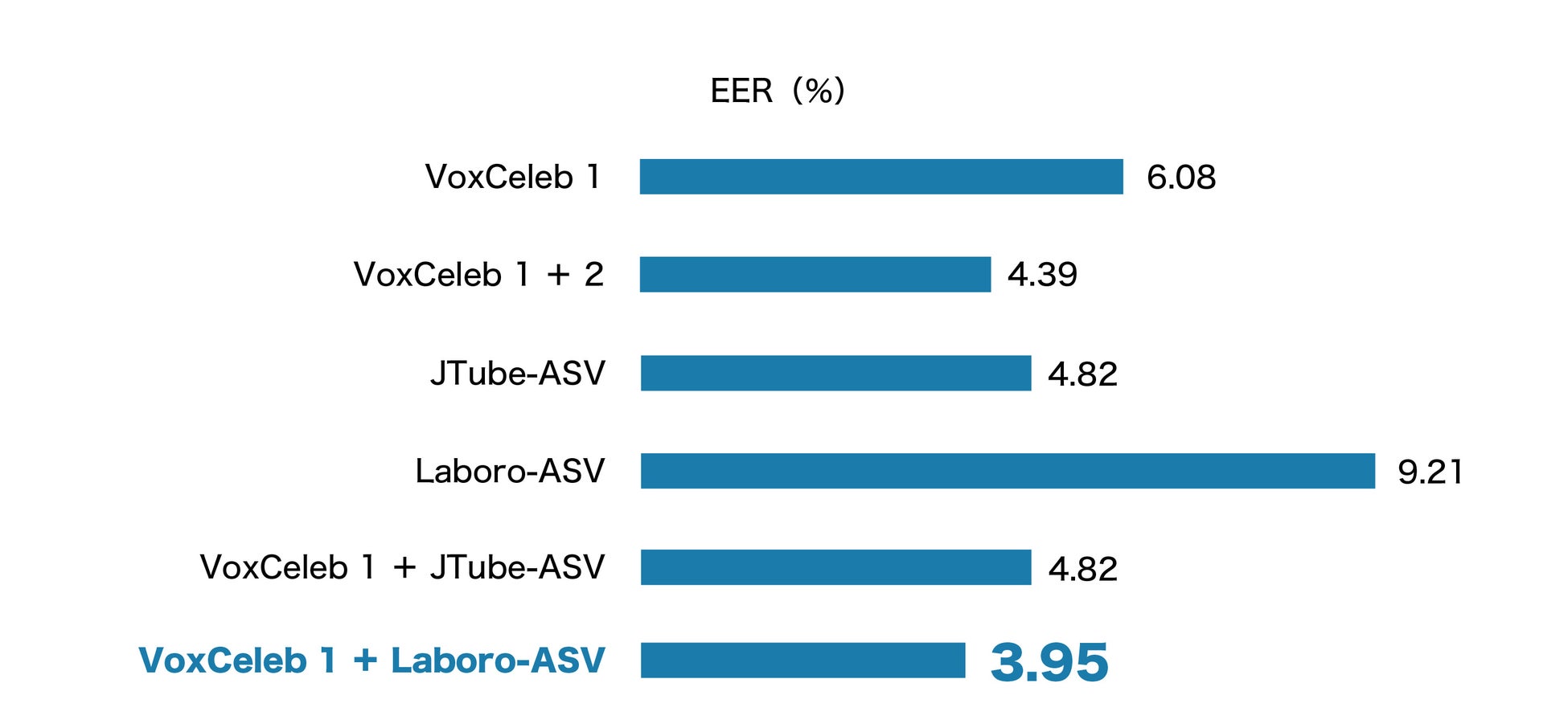 EERは低い方が良いとされており、比較実験の結果、VoxCeleb1とLaboro-ASVを組み合わせたデータセットで訓練されたモデルが最も良い性能を発揮できていることが上図からわかります。Laboro-ASVは、データ量の観点においては他の大規模データセットに比べて劣るものの、他のデータセットと併用することで日本語話者照合タスクの精度を向上させるために有効なデータセットであることを確認いたしました。