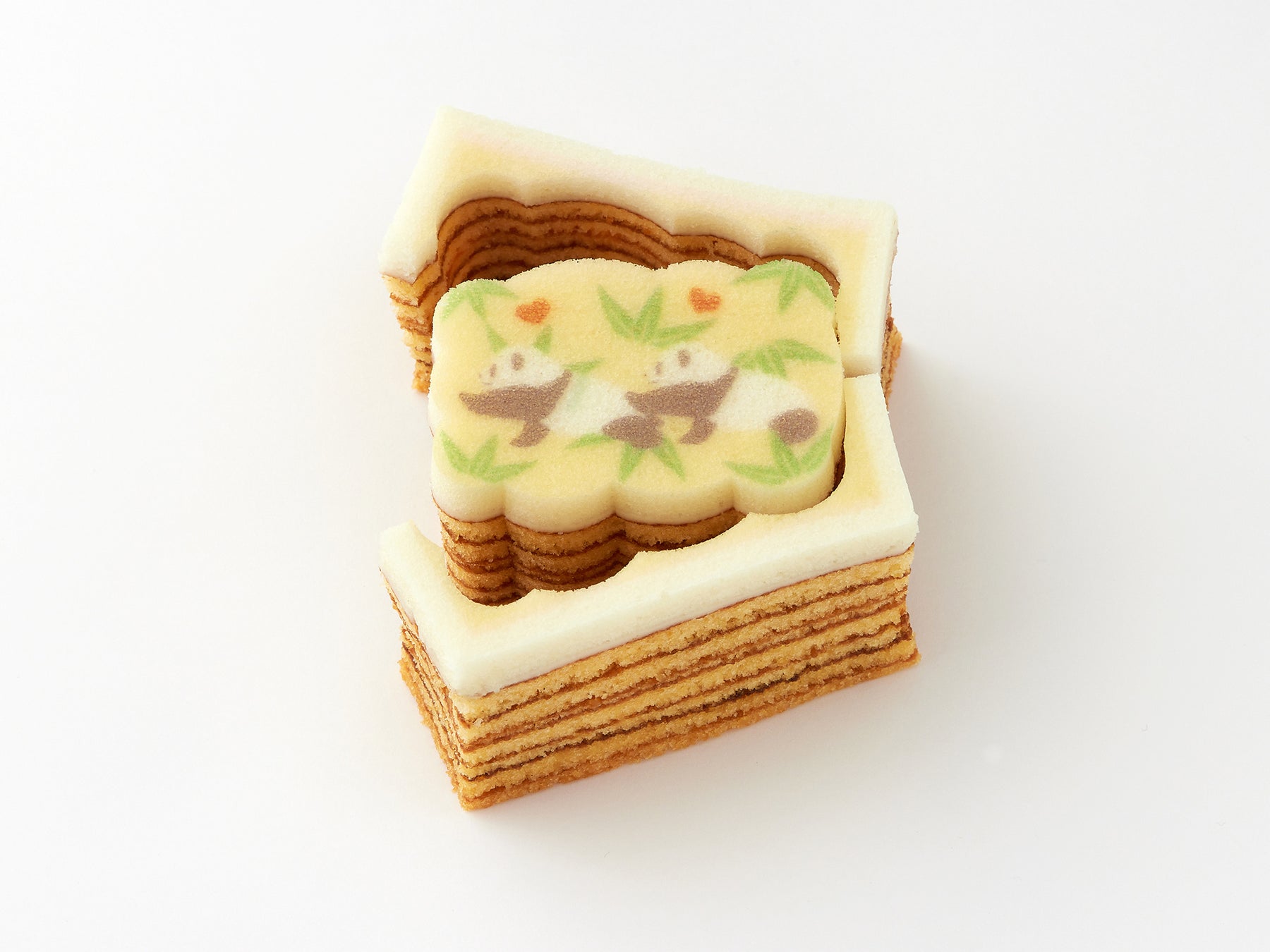 上野パンダファミリーをモチーフにした、並べて食べて楽しいバウムができました! おさんぽする姿がかわいい上野案内所オリジナルの絵柄は全部で4種類(リーリー、シンシン、シャンシャン、シャオシャオ&レイレイ)。どの絵柄が当たるかは開けてからのお楽しみ。バウムは卵とアーモンドがほのかに香る、やさしい甘さのプレーン味です。