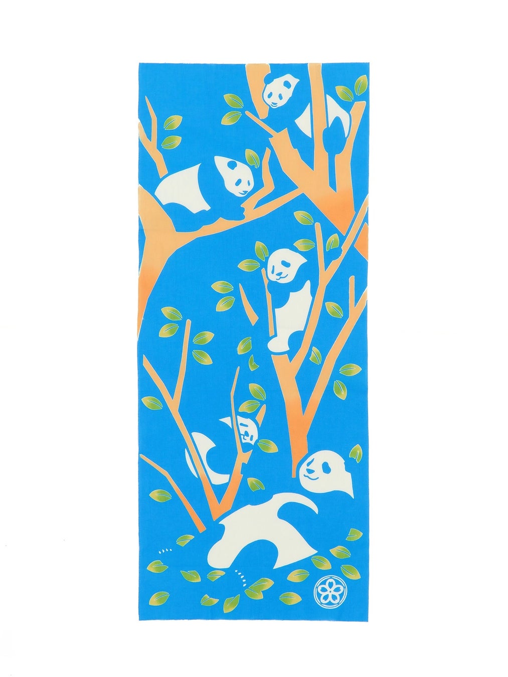 上野パンダファミリーをモチーフに、一枚一枚手で染めることにより醸しだされる味や雰囲気を愉しむことができる「注染(ちゅうせん)」の技法で、てぬぐいをつくりました。爽やかな空の下、木の上などで戯れる上野パンダファミリーをイメージし、美しい青地に染め上げています。ハンカチ代わりに使用しても、インテリアとして壁に飾っても楽しめます。