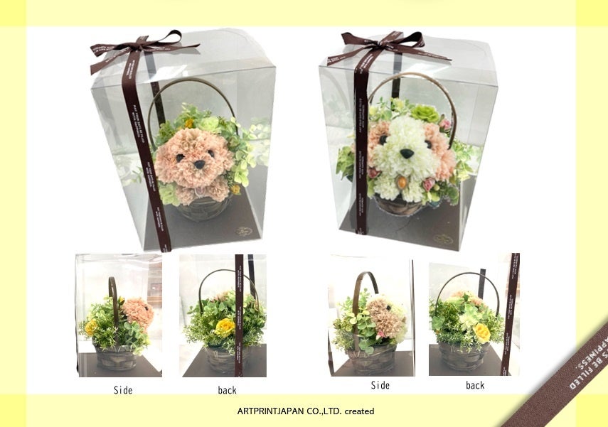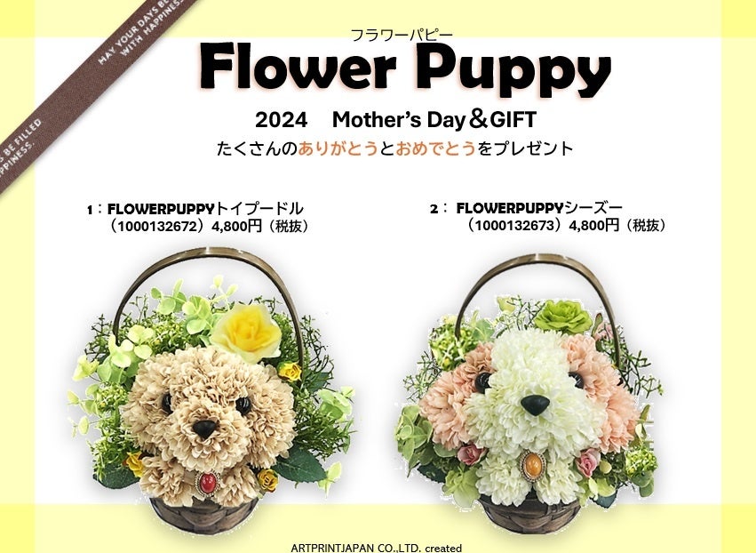 【アートプリントジャパン】母の日フラワーギフト『Flower Puppy』新発売。トイプードルとシーズーの子犬の表情をアートフラワーで表現。ハンドメイドのCuteな表情が人気。全国30店舗で販売開始