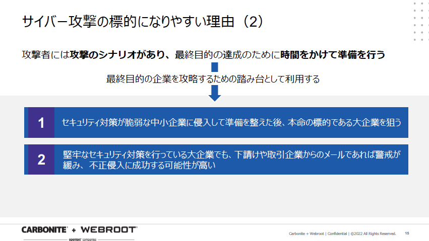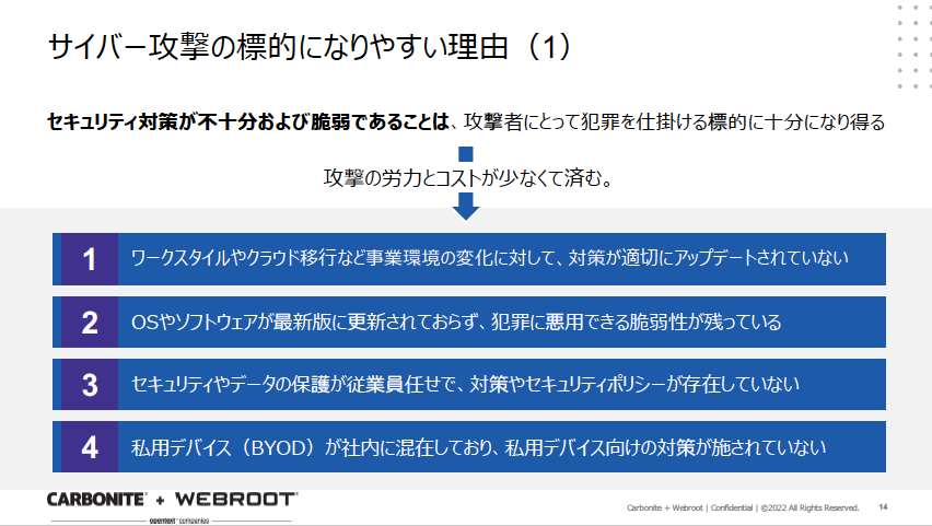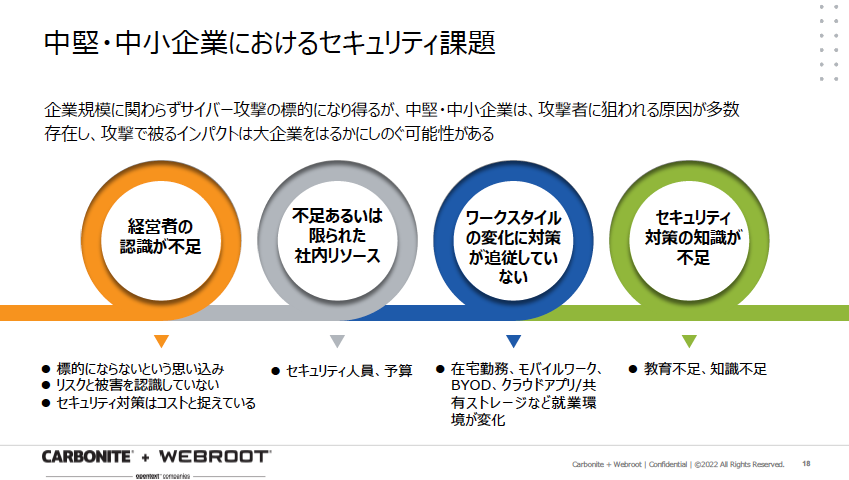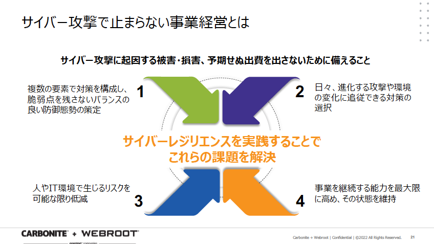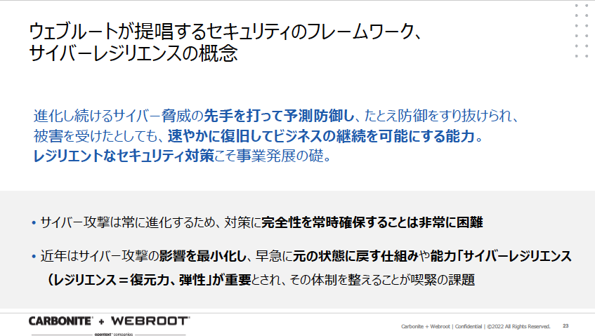 「企業がセキュリティ対策を考えるにあたって、我々が皆様にお伝えしたいのは、サイバー攻撃に起因する被害・損壊、予期せぬ出費を出さないために企業はサイバー攻撃の被害に遭うという前提で事前の準備が必要ということです。いまや1つのセキュリティ製品やソリューションで全てのサイバー攻撃を防ぐことは残念ながら難しいと言わざるを得ません。しかし、企業として考えなければいけないことは、サイバー攻撃の被害にあっても最小限の被害に食い止め、事業の継続を止めないことに注力すべきであるということです。これを我々はサイバーレジリエンスと呼んでいます。ウェブルートのサイバーレジリエンスは、単なる言葉だけでなく、それに基づいて製品を開発から販売させていただいています。メッセージと販売しているソリューションが一体となっているところが大きな特徴となっています。」