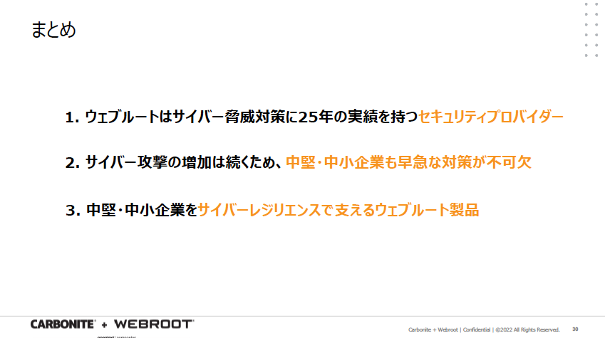 ウェブルートは中堅・中小企業のセキュリティを強化するため、今後もサイバーレジリエンスの重要性について啓発を行い、日本の中堅・中小企業のサイバーセキュリティ対策の強化に貢献することを目指します。