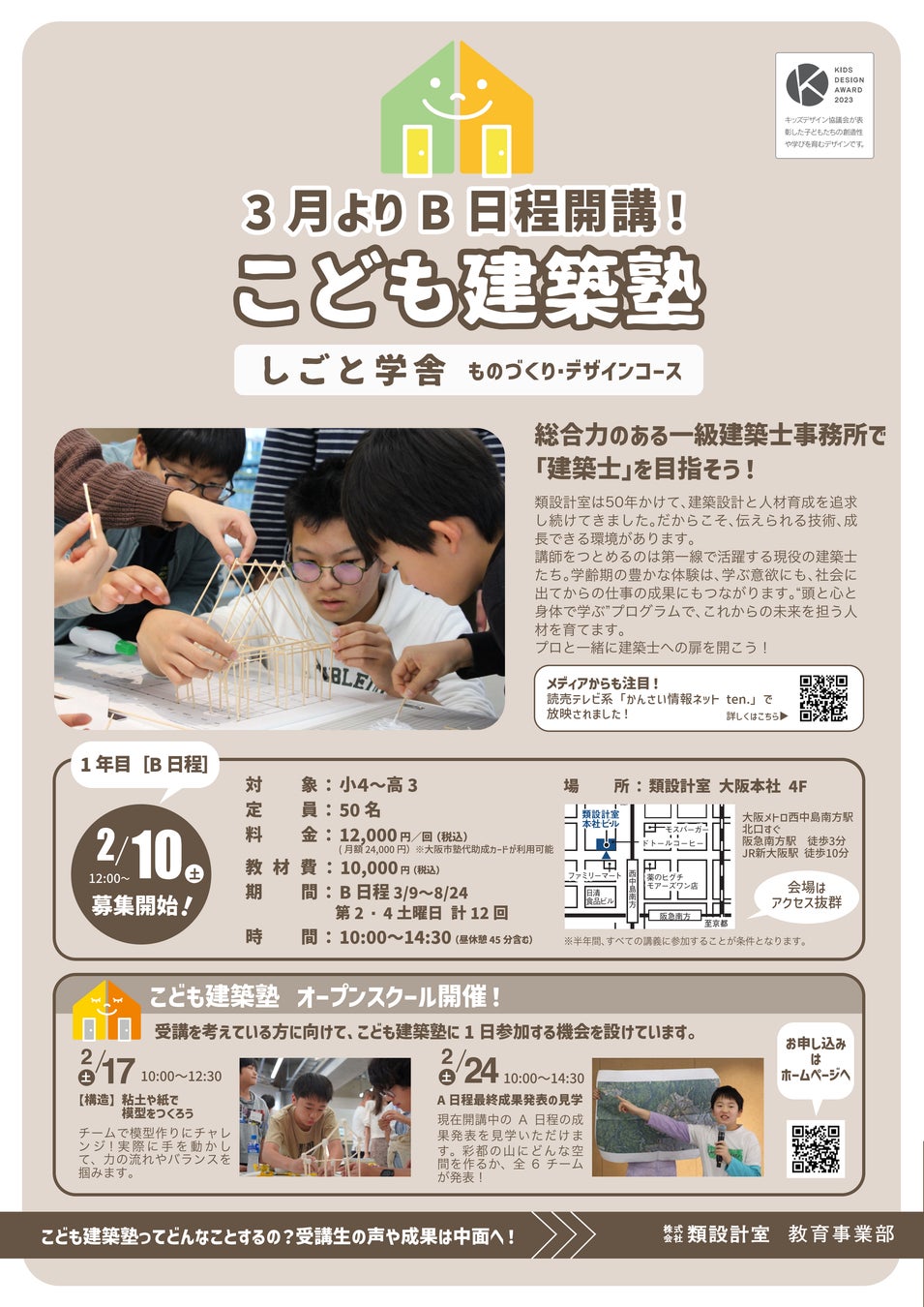 【こども建築塾】「こども建築塾」(大阪)1年目のB日程 募集を開始 子どもたちが建築について、一級建築士から学ぶ!~3月9日初回講義、B日程は「環境」がテーマ