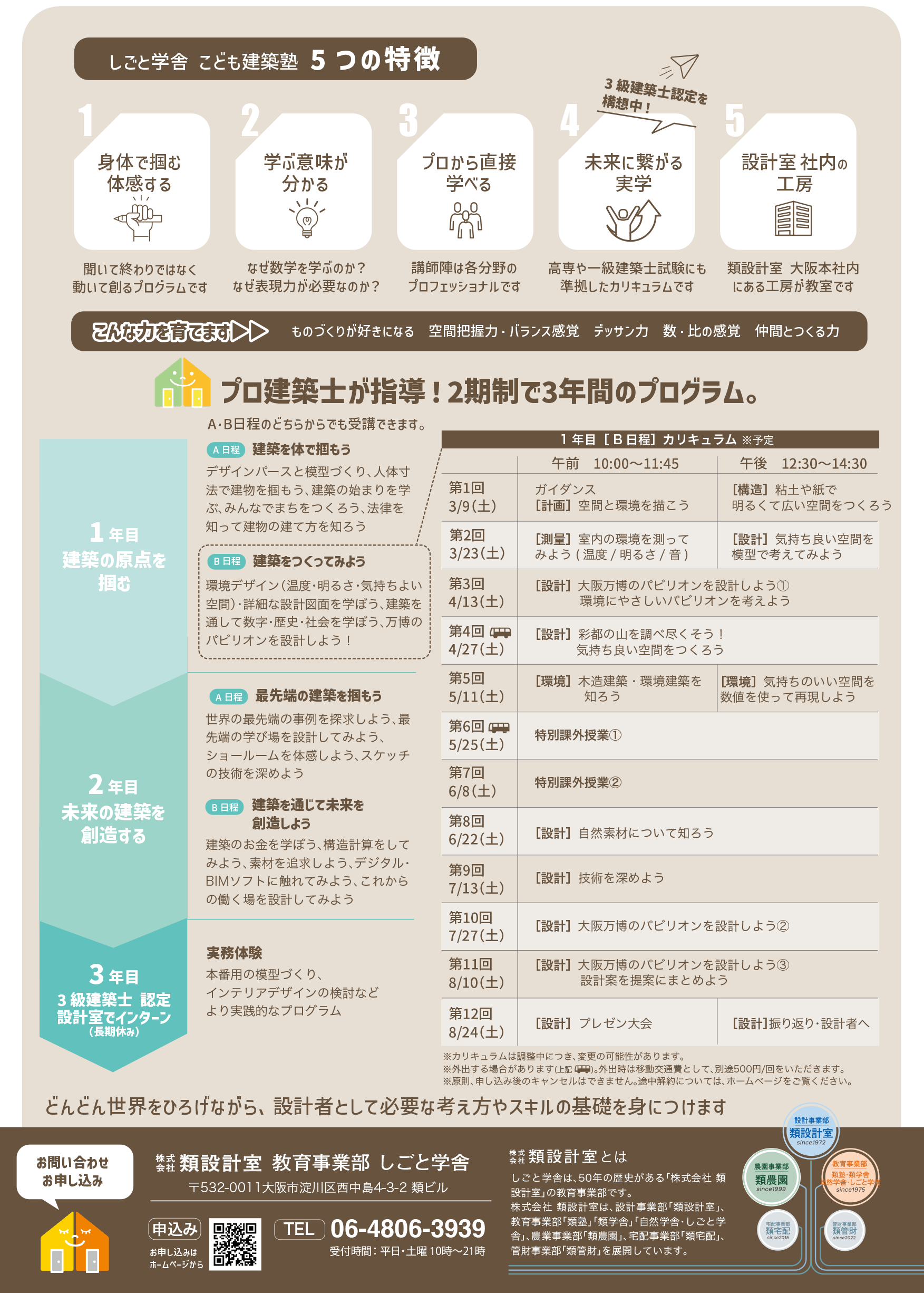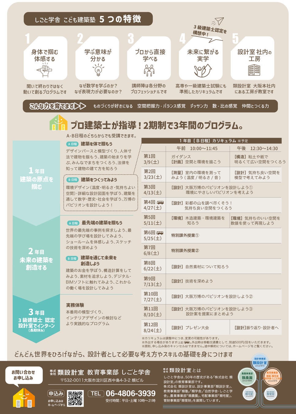弊社は50年かけて建築設計と人材育成を追求し、伝えられる技術と成長できる環境があります。その成果を子どもたち伝えたい――その思いで、こども建築塾は、類塾しごと学舎のものづくり・デザインコースとして、昨年9月にスタートしました。第一線で活躍する現役の建築士たちが講師をつとめ、“頭と心と身体で学ぶ”プログラムで、これからの未来を担う人材を育てます。学齢期の豊かな体験は、学ぶ意欲にも、社会に出てからの仕事の成果にもつながります。