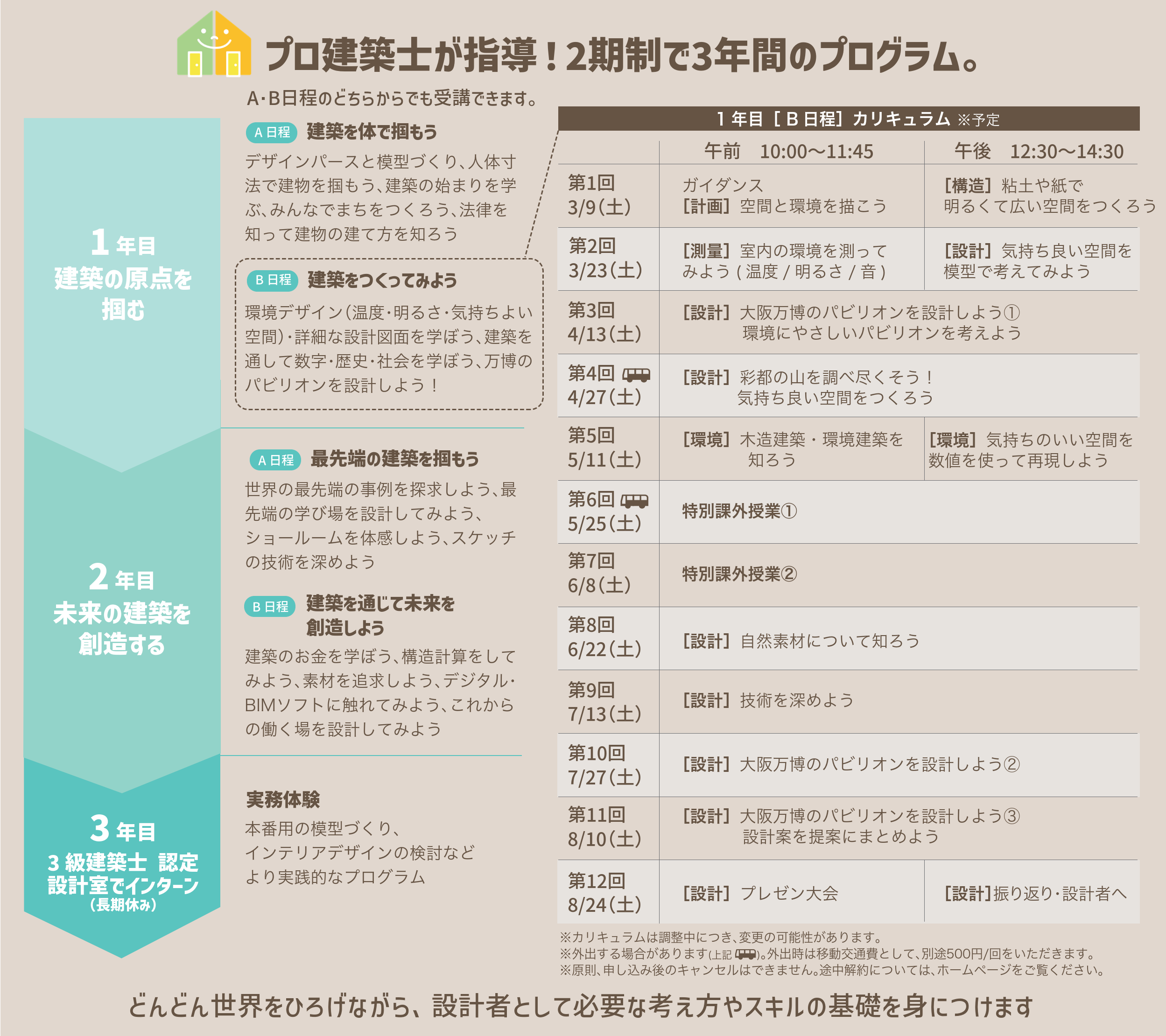 「こども建築塾」は建築を切り口にものづくりの楽しさを学べる塾で、1年をA日程・B日程に分け、3カ年のカリキュラムを想定。1年目のA日程は2月24日(土)に終了し、1年目のB日程が3月9日(土)からスタートします。B日程は「環境」がテーマです。A日程を受講していないお子様もB日程から受講できます。