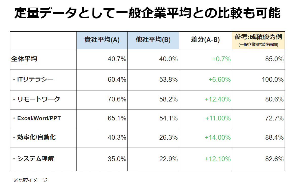 ③ 他社企業平均との比較:自社のITスキルレベルが業界内でどの位置にあるのかを定量的に評価可能。