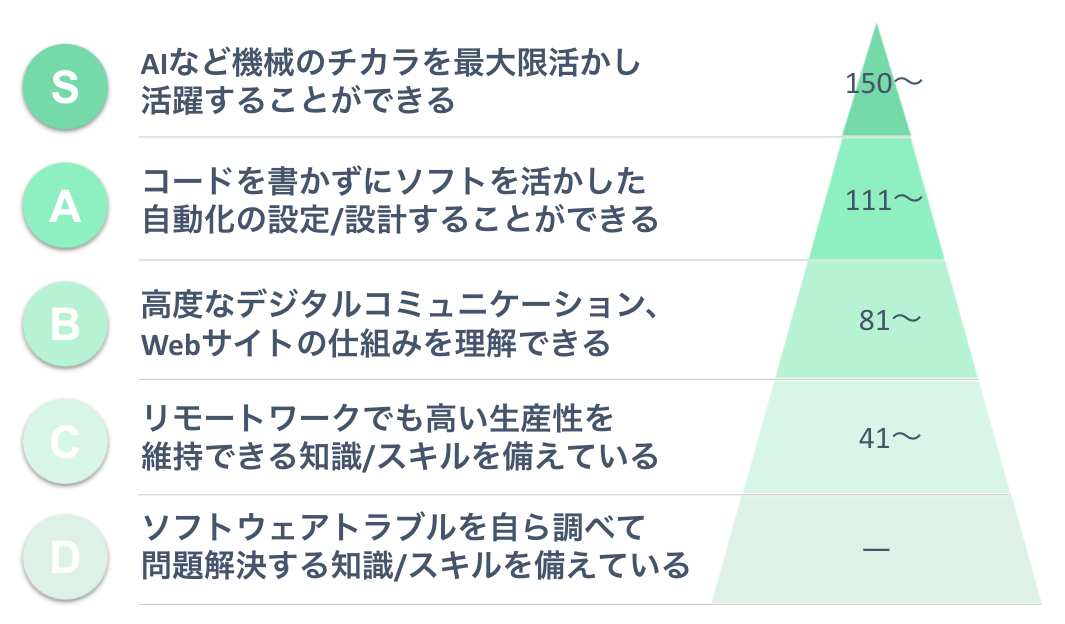① 10段階でのITスキルレベル評価:従業員のITスキルがどのレベルにあるのか一目で分かります。