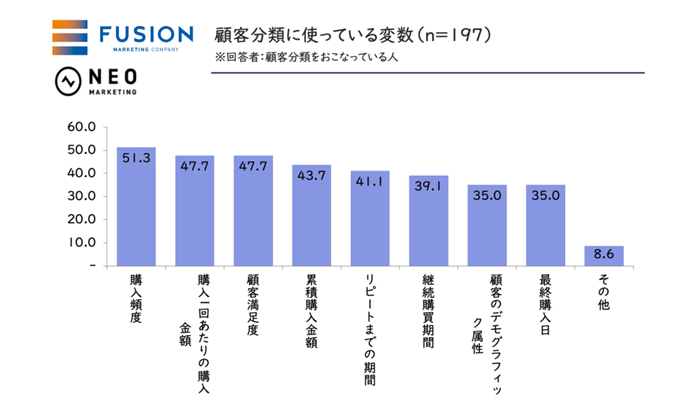 「購入頻度」が51.3%と、顧客分類の変数として最もメジャーであることがわかりました。