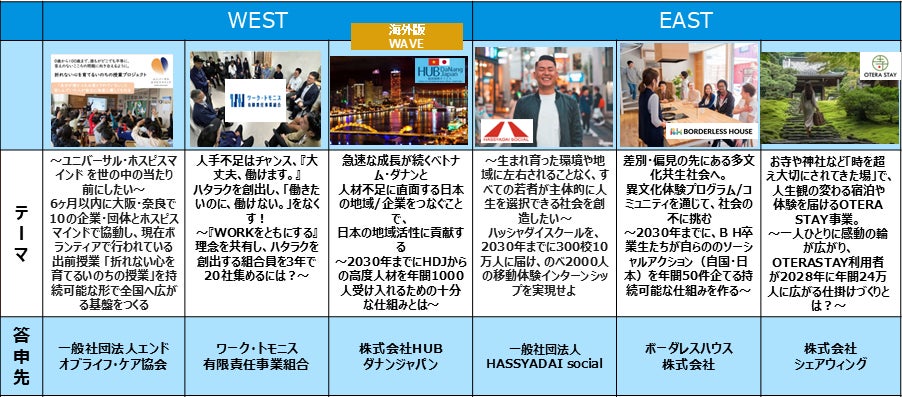 | 2025年6月からは以下6つのリアルな社会課題に対して、異業種混合でチームを組んで取り組んでいきます。今回、海外版WAVE(2024年から実施)も夏期プロジェクトとして合同実施、19名が参加します。