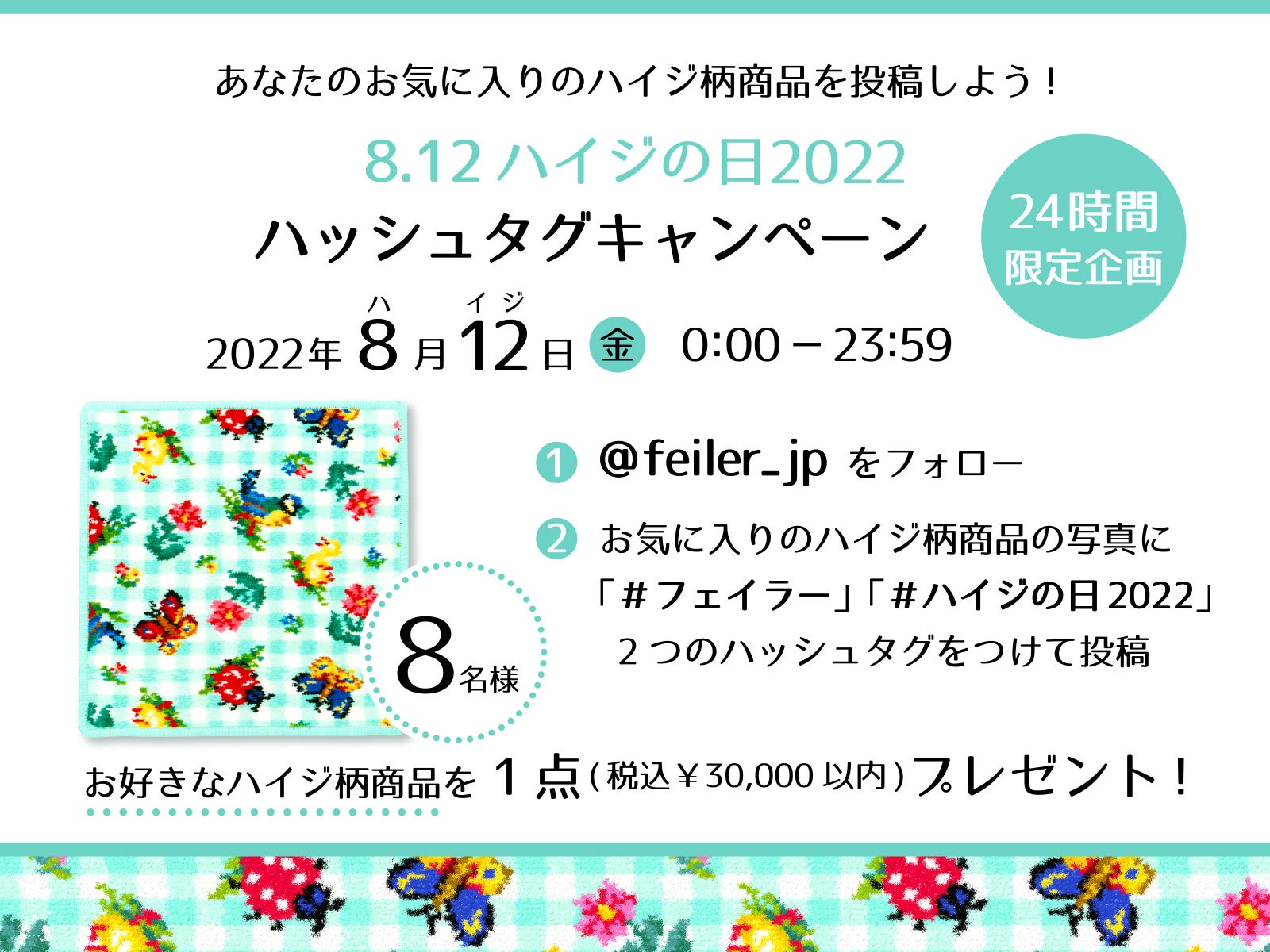 #ハイジの日 は、8月12日が812(ハイジ)と読めることから、フェイラーの人気柄『ハイジ』を愛するフェイラーファンが作った記念日であり、この1日限定で、フェイラーの公式InstagramまたはTwitterをフォローの上、お気に入りのハイジ柄商品の写真に「#フェイラー」「#ハイジの日2022」 の2つのハッシュタグをつけて投稿し、みんなで一緒にハイジの日をお祝いする、フェイラーファンにとって特別なイベントになっています。