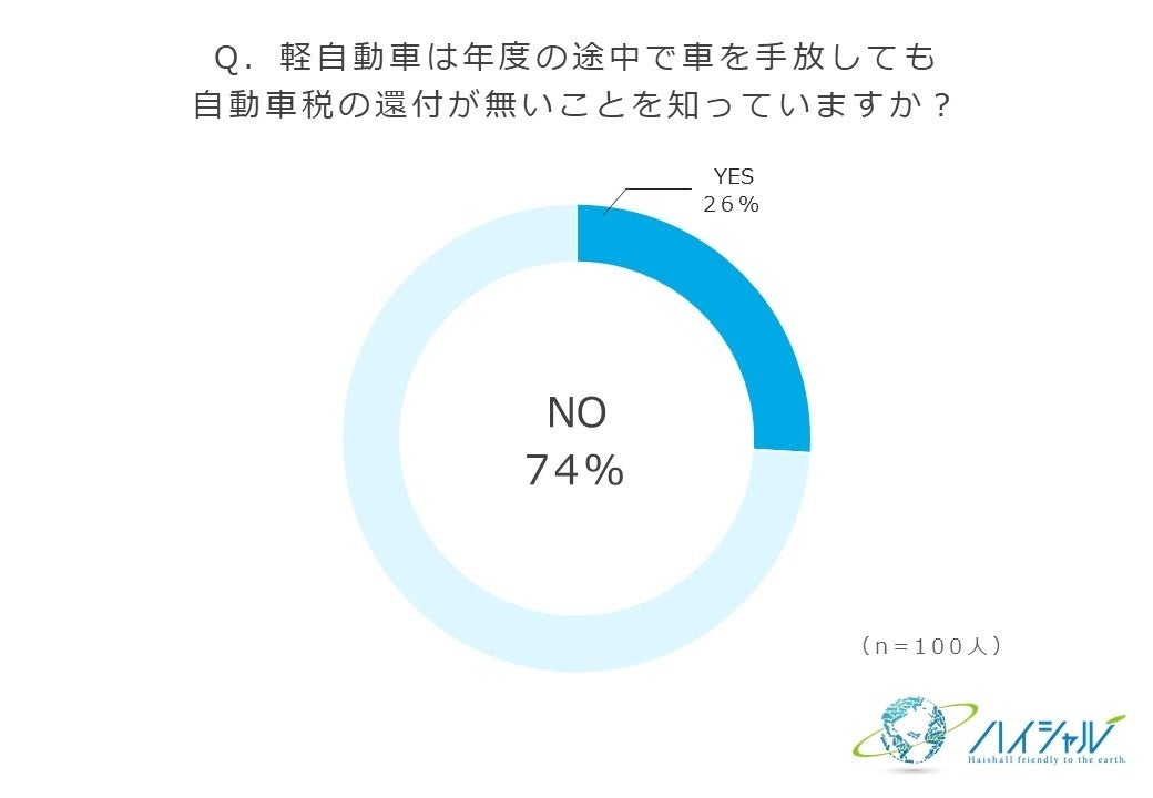 ユニオンエタニティ株式会社(本社:大阪市西区、代表取締役社長:安部哲史)が運営する廃車の買取りサイト『ハイシャル(https://haishall.jp)』では、毎年4月1日に自動車の所有者に対し翌年の自動車税が課されることが要因し、3月は廃車の申込みが殺到しています。しかし、軽自動車ユーザー100名にアンケート調査を行ったところ、【軽自動車は自動車税の還付が無い】ことを「知らない」と答えた人が74%と半数を大幅に上回ったことを受け、軽自動車ユーザーに自動車税の還付が無いことを認知してもらうためにも3月に軽自動車の買取りを強化することをお知らせします。
