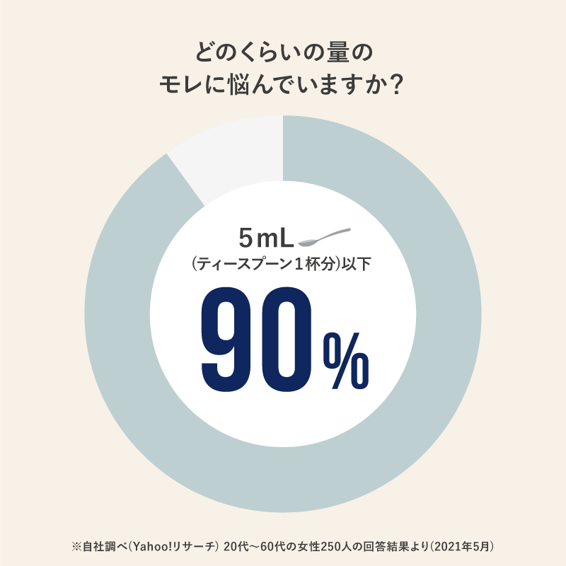 尿モレに悩む女性の90%は、5mL(ティースプーン1杯分)以下の少しのモレに悩んでいました。さらに10mL(ティースプーン2杯分)以下の尿モレは98%の女性が経験しているとわかりました。(※3)
