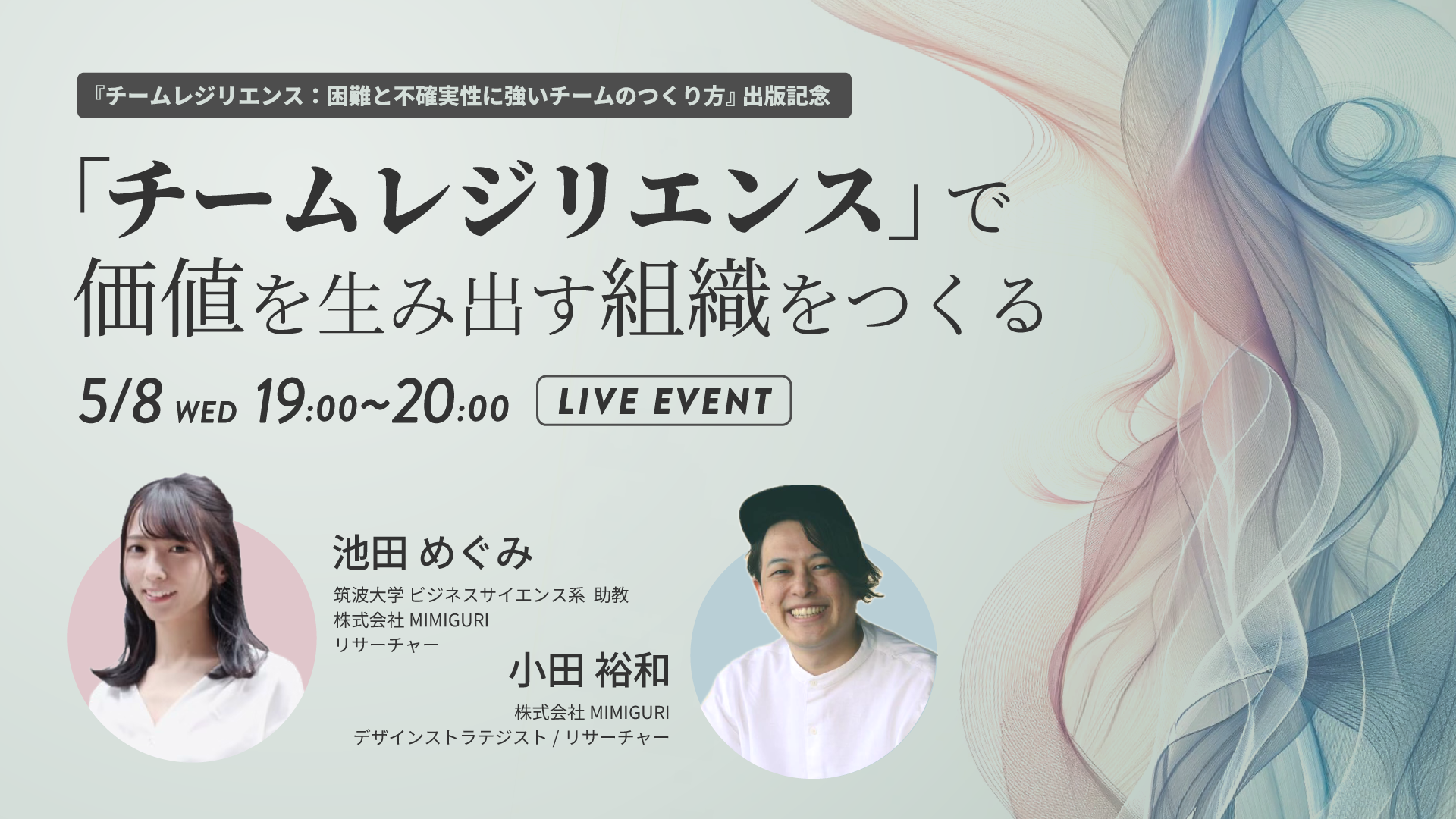 本書の著者である池田めぐみと、 『アイデアが実り続ける「場」のデザイン』著者 小田裕和(株式会社MIMIGURI デザインストラテジスト/リサーチャー)が登壇します。価値創出の観点に一歩踏み込みながら、チームのしなやかさの重要性が増している背景や、レジリエントなチームとそうでないチームの違い、柔軟なチームを構築するために重要な要素について深掘りしていきます。ぜひお気軽にご参加ください。
