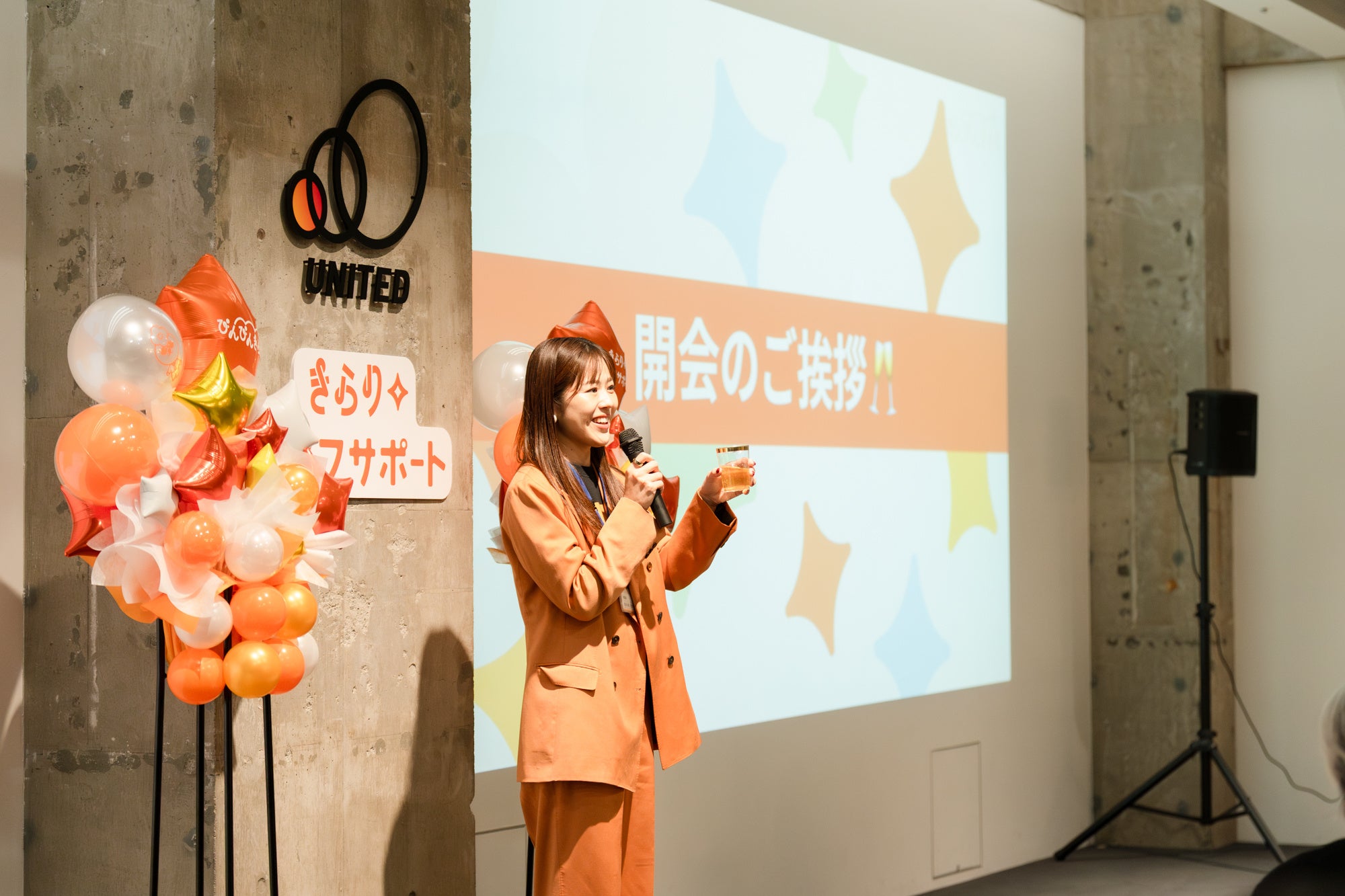 開会では、代表取締役・喜多尾衣利子より創業の想いやこれまでの歩み、きらりさんへの感謝をお伝えし、乾杯のご挨拶で会がスタート。会場は終始あたたかな空気に包まれ、食事とともに自然な交流が広がりました。