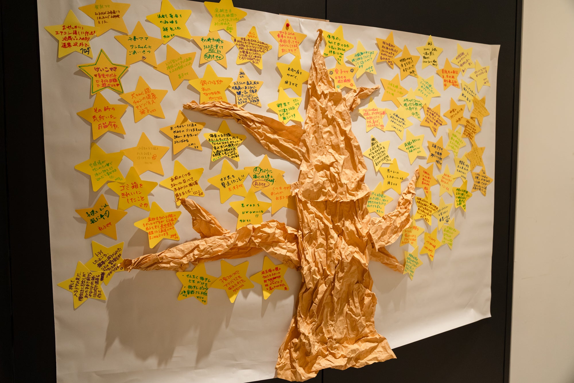 歓談タイムには、日々のサポートで「やって喜ばれたおせっかい」をカードに記入いただき、会場に一つの大きな「おせっかいの木」として掲示。「お子さんと一緒によく卵焼きを作ります」、「パジャマの膝の穴を修復してあげた」といったほっこりするおせっかいや、「カメムシを撃退した!」というおもしろエピソードも。きらりさんによる気づかいの工夫が可視化され、互いの学びにもつながる企画となりました。