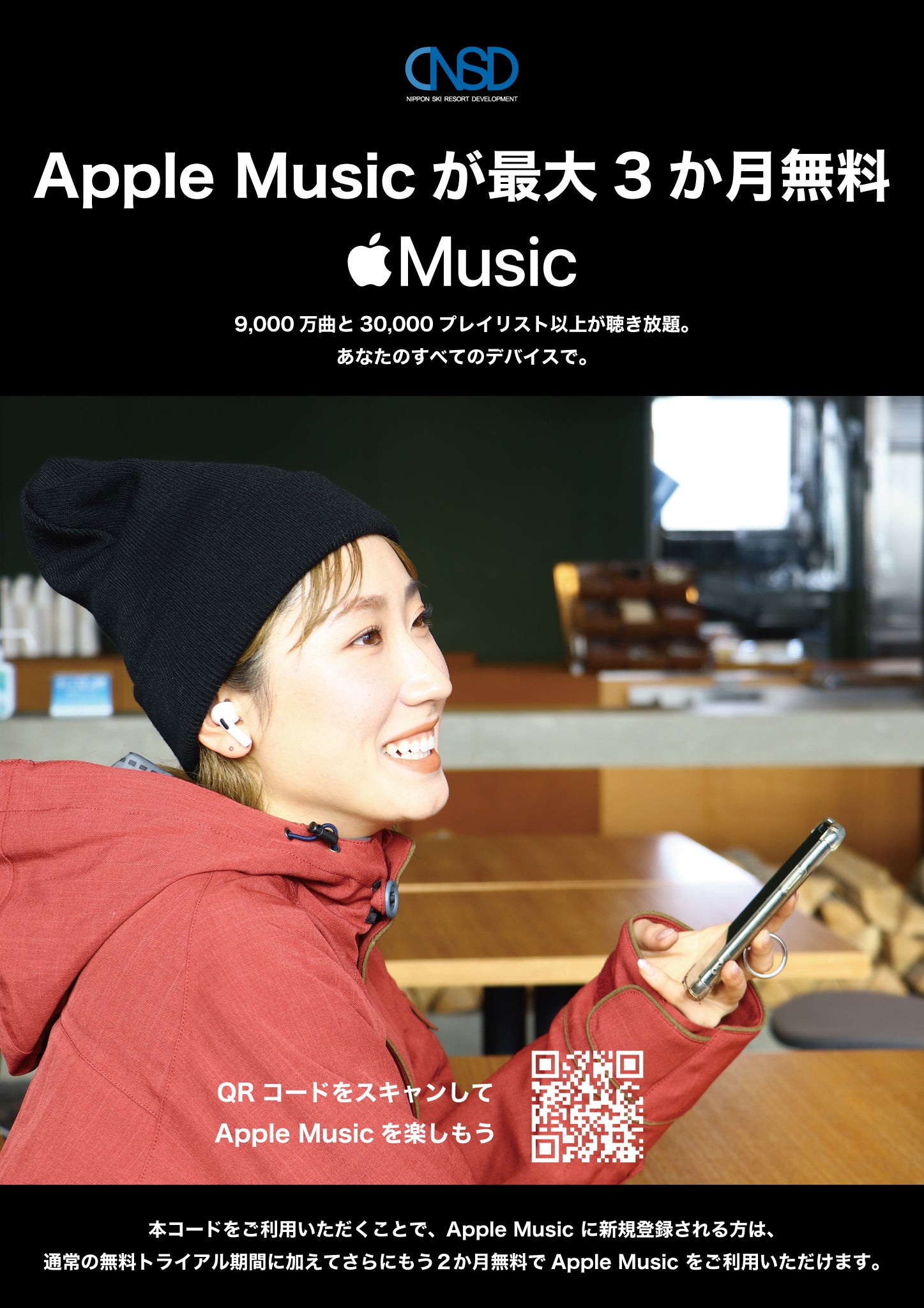 現在Apple Music では、新規利用登録の1か月無料トライアル期間を実施しておりますが、NSDグループスキー場およびパートナーリゾートの10スキー場内だけで掲出する「二次元バーコード」からアクセスすることで、2か月延長(計3か月)無料の特典を2022年2月4日より開始いたします。