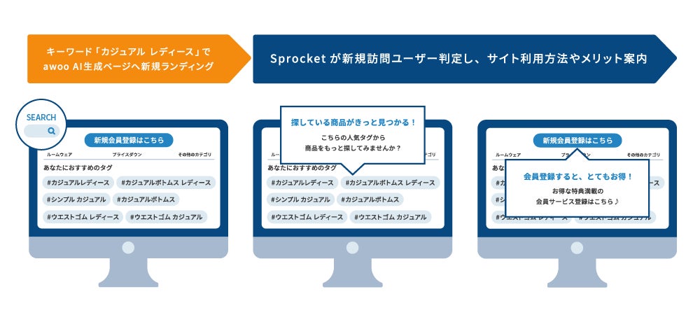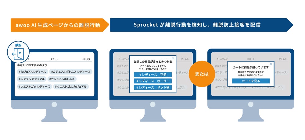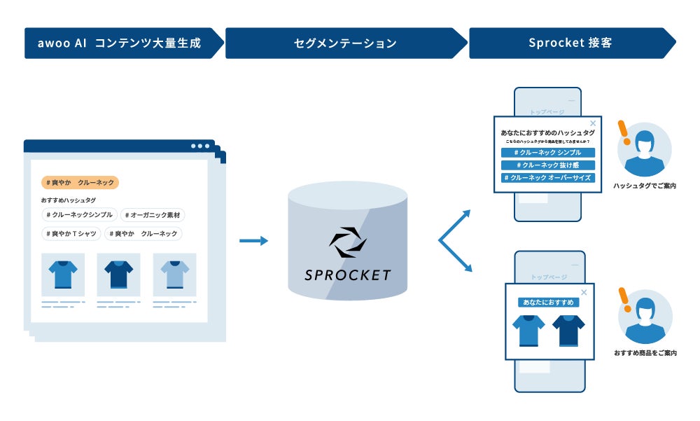 本来、awoo AIは、ユーザー自身がページ上に表示されるハッシュタグを発見しボタンを押す必要があり、awoo AIの活用はユーザーの行動に委ねられていました。今回のシステム連携により、ユーザーの属性や行動データに基づき、Web上のポップアップを用いてパーソナライズされたWeb接客を提供する「Sprocket」と、商品特徴を示すハッシュタグ機能を提供する「awoo AI」を組み合わせることで、ユーザー1人ひとりにとって最適な内容、場所、タイミングで「awoo AI」 が自動生成するコンテンツを案内することが可能になります。Sprocketとawoo AIを掛け合わせることにより、ユーザーに対してはより良いサイト体験の提供を、導入事業者様にとってはサイト回遊とさらなる売上向上の提案を目指します。