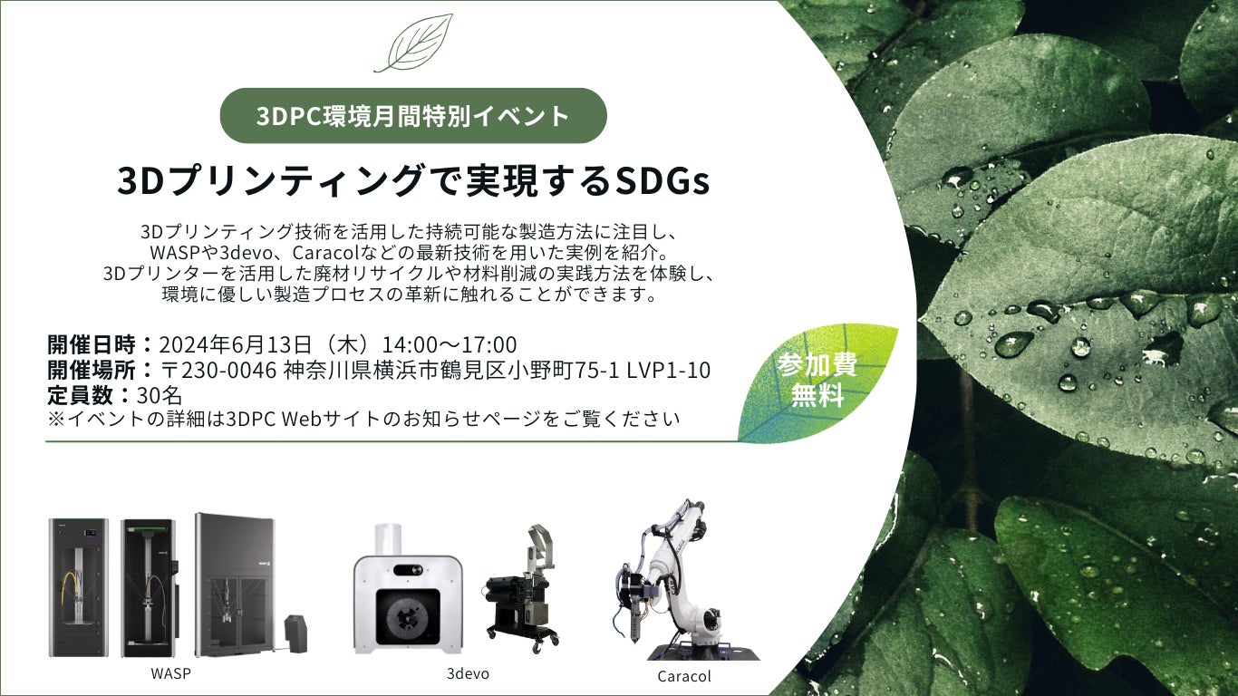 株式会社3D Printing Corporation(本社:神奈川県横浜市、代表取締役:デヴォア・アレキサンダー、以下「3DPC」)は、2024年6月13日(木)に初となる自社開催のイベント「3DPC環境月間特別イベント:3Dプリンティングで実現するSDGs」を開催することをお知らせいたします。