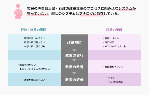 この原因として政策立案プロセスに市民が関与する手段がアナログに依存していることが挙げられ、国内においては、多様な国民意見を聴くための手法の開発が大幅に遅れているといえます。