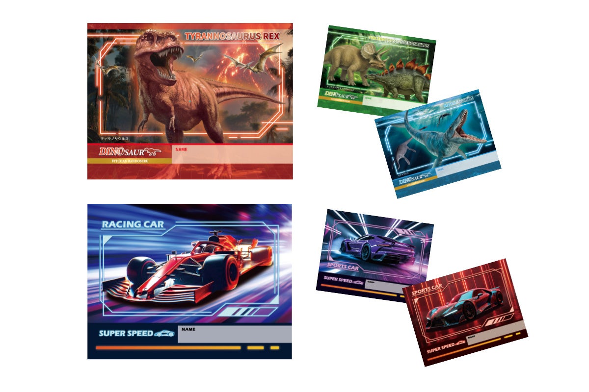 ① 男の子に人気のモチーフ「恐竜」「車」を取り入れた新シリーズ。
