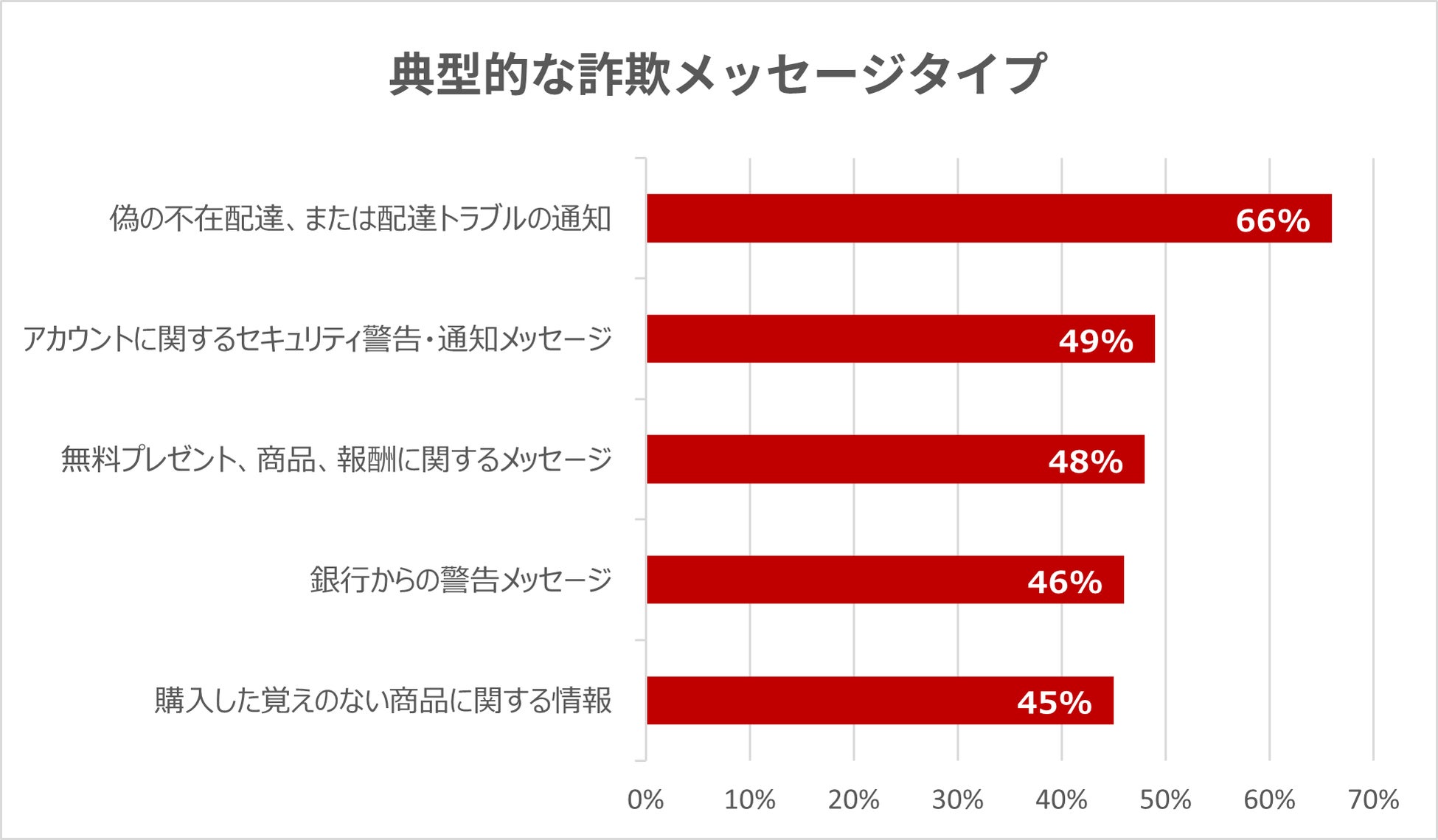 典型的な詐欺メッセージのタイプは、「偽の不在配達、または配達トラブルの通知」が66%で1位。「アマゾンまたは類似のアカウントに関するセキュリティ警告・通知メッセージ」「懸賞に当選など無料プレゼント、商品、報酬に関するメッセージ」「銀行からの警告メッセージ」「購入した覚えのない商品に関する情報」が各40%台です。