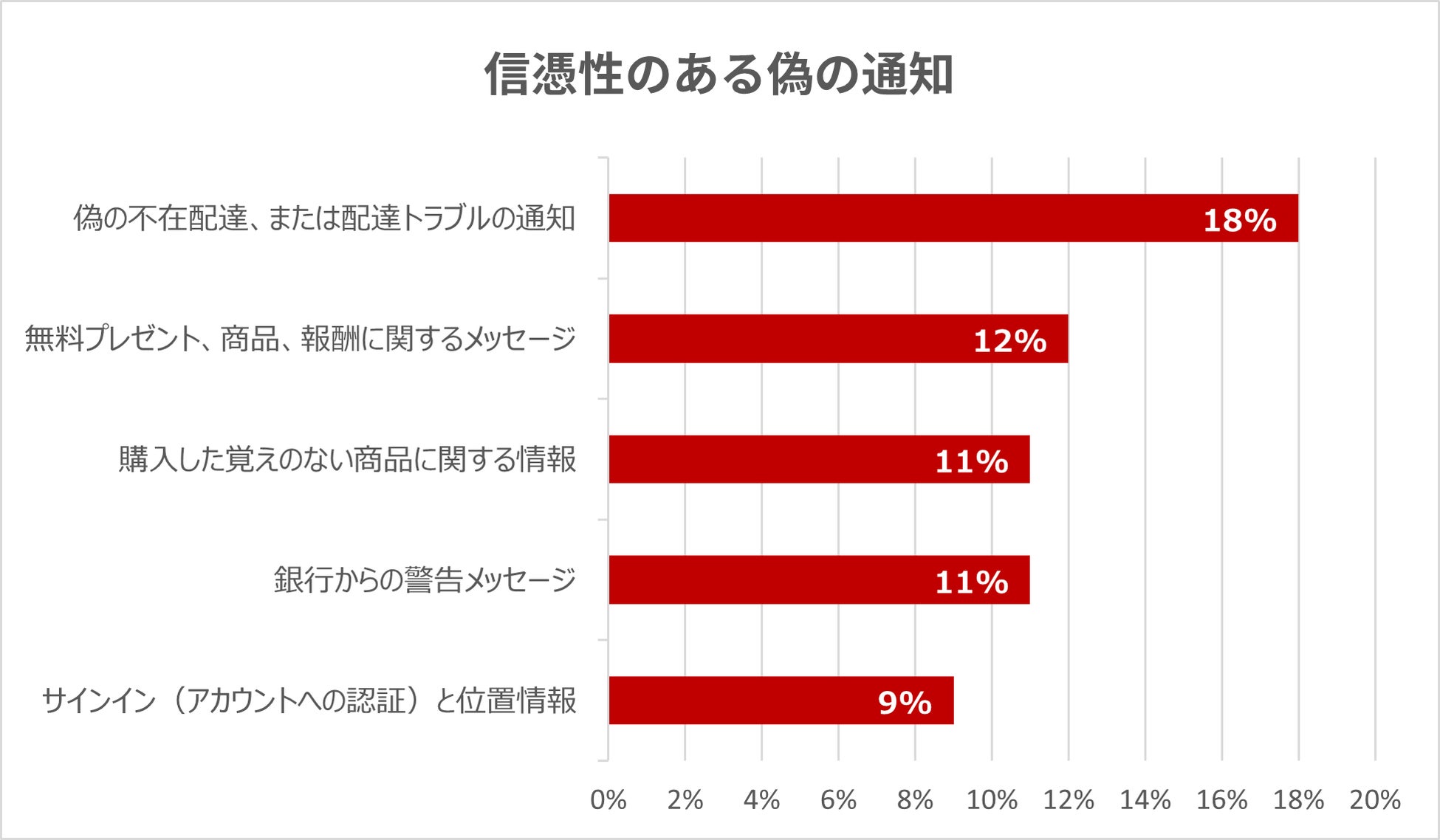 調査回答者の43%が1通以上の詐欺通知を本物だと信じたことがあります。詐欺だと判別が困難な信憑性のある偽の通知は、「偽の不在配達、または配達トラブルの通知」が18%、「懸賞に当選といった無料プレゼント、商品、報酬に関する内容」が12%、「購入した覚えのない商品に関する情報」「銀行からの警告メッセージ 」が11%。「サインイン(アカウントへの認証)と位置情報」が9%です。