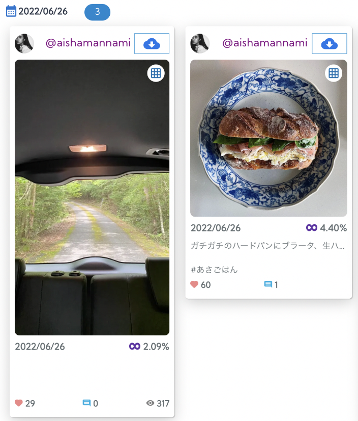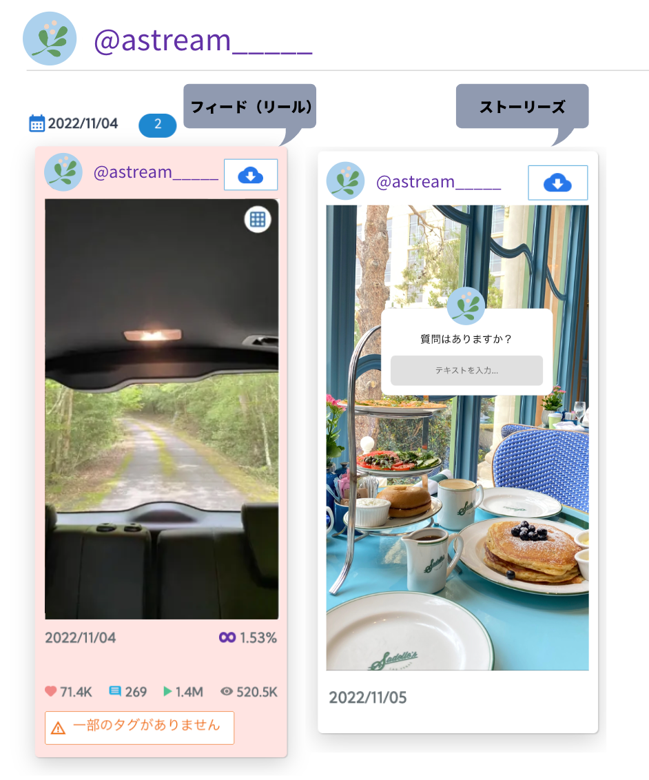 また、24時間で消えてしまうストーリーズの取得も可能になりました。取得した投稿は、ツールの画面上で「いいね数」「コメント数」「再生数(リール)」「エンゲージメント」を確認できます。