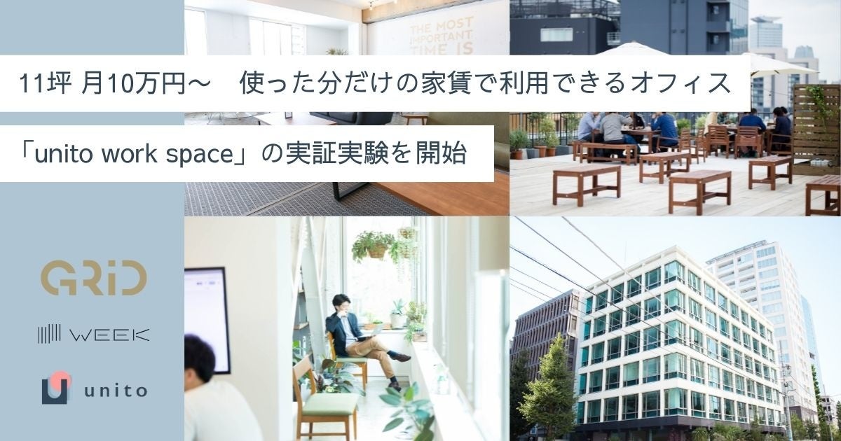 住んだ分だけの家賃で暮らせる部屋「unito」を運営する株式会社Unito(東京都千代田区、代表取締役:近藤佑太朗、以下ユニット)は、コミュニティビル「Nagatacho GRiD」を運営する株式会社ガイアックス(本社:東京都千代田区、代表執行役社長:上田 祐司、証券コード:3775、以下ガイアックス )、曜日オフィス「WEEK」を運営するサンフロンティア不動産株式会社(本社:東京都千代田区、代表取締役社長:齋藤清一、証券コード:8934、以下サンフロンティア)、株式会社Pictors & Company(本社:東京都新宿区、代表取締役CEO:水口史椰、以下Pictors & Company)と4社合同で、使った分だけの家賃で利用できるオフィス「unito work space」の実証実験を開始します。
