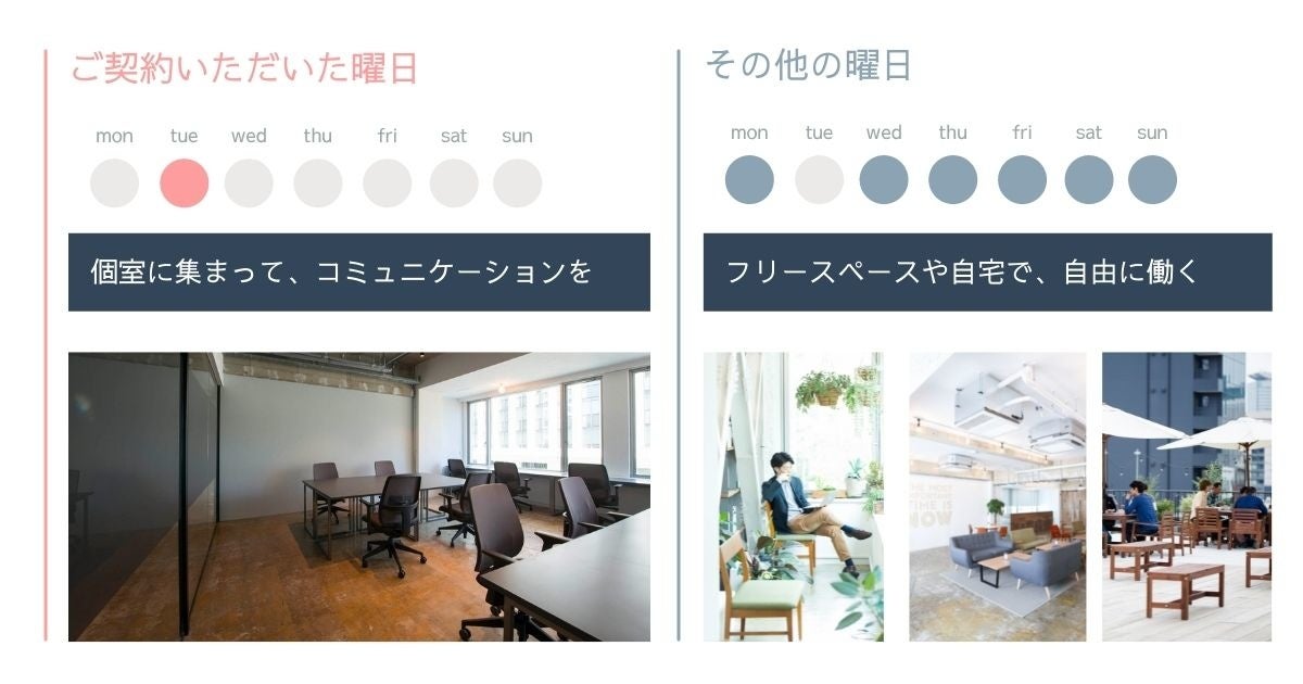 共有スペースについては、契約していない曜日も含めて、毎日利用することができ、一人ひとりの従業員にフィットした、ハイブリッド勤務を可能にします。