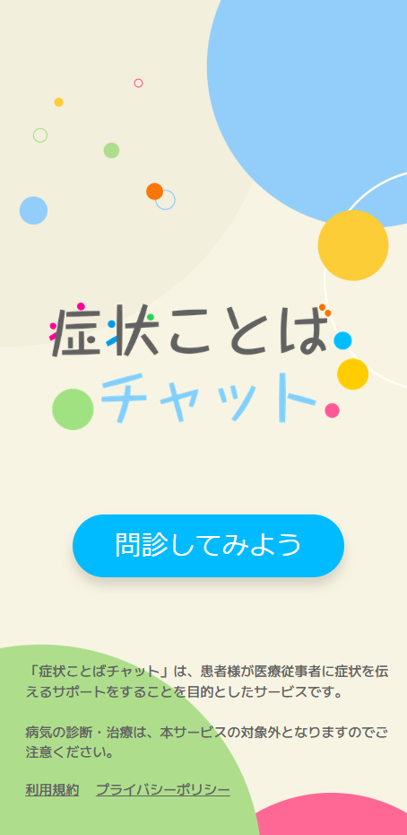 『症状ことばチャット』は、患者様の伝えたいこと、話したいこと、また診察中のコミュニケーションだけでは捉えることが難しい患者様のライフスタイルや価値観を優しくヒアリングしながらチャット(会話)を進め、最終的に医療形式にて出⼒されることで患者様にも医療従事者にも有効活⽤できるサービスです。