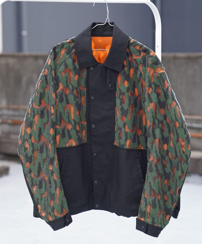意匠性の高い生地をメインにしたショート丈のブルゾン。レースの透け感を活かすために、裏地には発色の良いオレンジの生地を採用しました。表地から透けて見えるオレンジが、コーディネートに良いアクセントをもたらします。最大の特徴である左袖の隠しポケットは、自転車で移動するときのニーズから生まれました。アウトドアでは自然に調和し、街では風景に映えるため、あらゆる場面でシーンレスに着用していただきたい一着です。