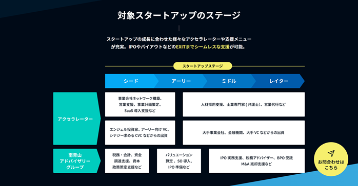 南⻘⼭リーダーズ株式会社を含む、南⻘⼭アドバイザリーグループは、税務・会計のコンサルティングファームという⽴場から、これまで1000件を超える案件に携わってまいりました。また、IPO・M&Aを⽬指す経営者を⽀援するコミュニティ『IPO・M&A ACADEMY』 を⽴ち上げるなど、多くのスタートアップ企業の資⾦調達及び事業⽀援を⾏っています。