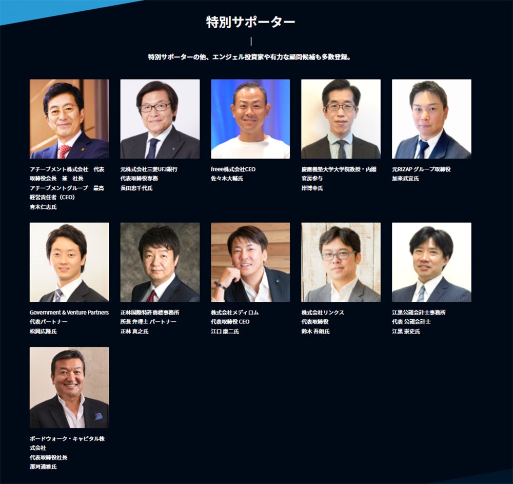 特別サポーターとして多くの著名⼈にご参画いただきました。特別サポーターの皆様は、投資家として、事業アドバイザーとして、さまざまなかたちで『LEADERS online(リーダーズオンライン)』および、スタートアップ企業へのサポートをしていただきます。