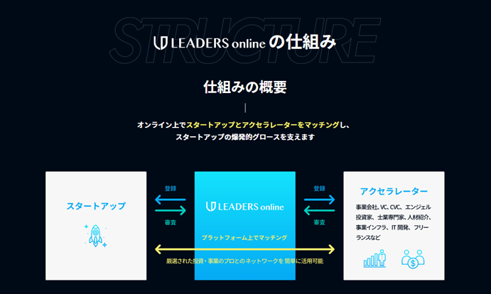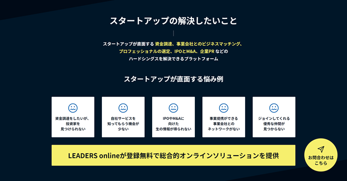 『LEADERS online(リーダーズオンライン)』は、スタートアップ企業が直面する資金調達、事業会社とのビジネスマッチング、プロフェッショナルの選定、IPOとM&A、企業PR などのハードシングスを解決できるプラットフォームです。