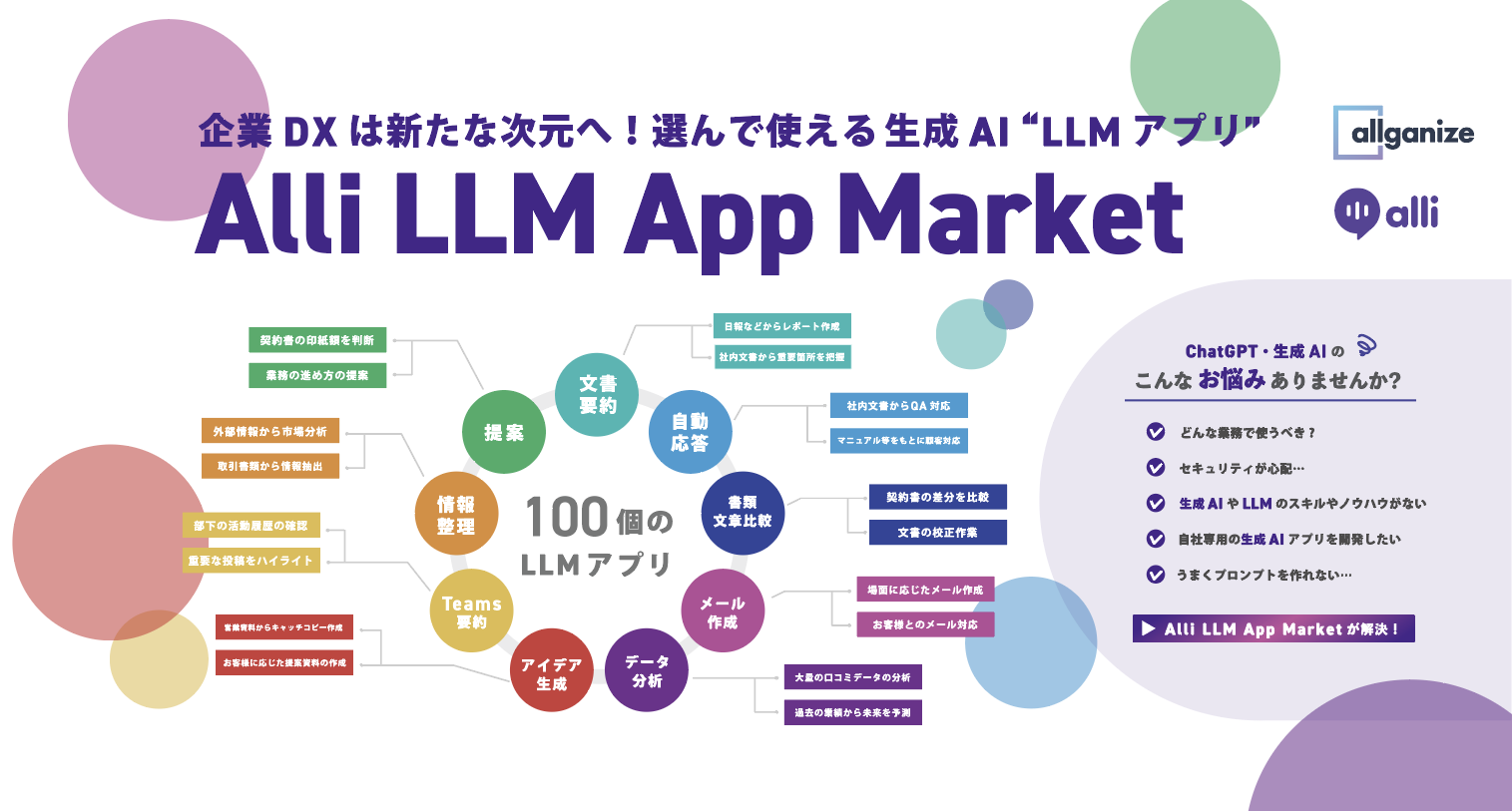 展示ブースでは、"特定文書の要約" "メール文面自動作成" "社内ドキュメントからの自動応答"など、すぐに業務適用可能な生成AI、LLMアプリを100個以上ご提供する「Alli LLM App Market」を中心に、AIチャットボット「Alli(アリィ)」、請求書情報抽出「Alli for Invoice」など、業務の最適化・コスト削減・DXを実現する先端の自然言語理解AIソリューションを展示いたします。