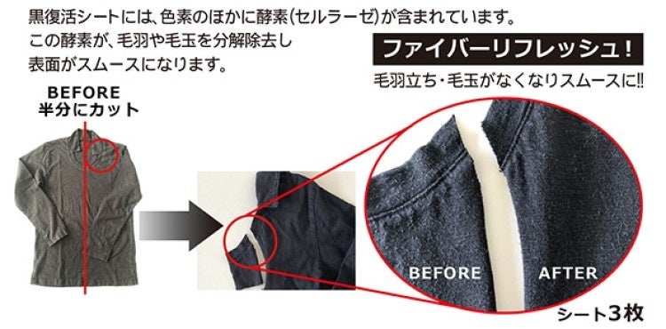 黒復活シートには、色素のほかに酵素(セルラーゼ)が含まれています。この酵素がケバ・毛玉を分解除去し表面をスムースにします。