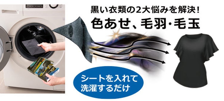 黒い衣類を集め、シートを入れて洗濯するだけで色あせとケバだちの悩みを一度に解決できる、今までにない新洗濯常識。